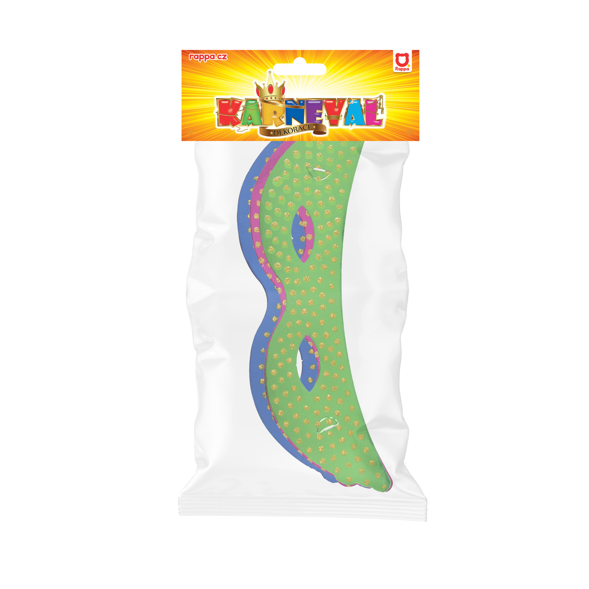 Tajemná škraboška! Tento parádní kousek na gumičku nabízíme v různých barvách po 6 kusech v balení. Škraboška je zdobena oslnivými puntíky se zlatými třpytkami.