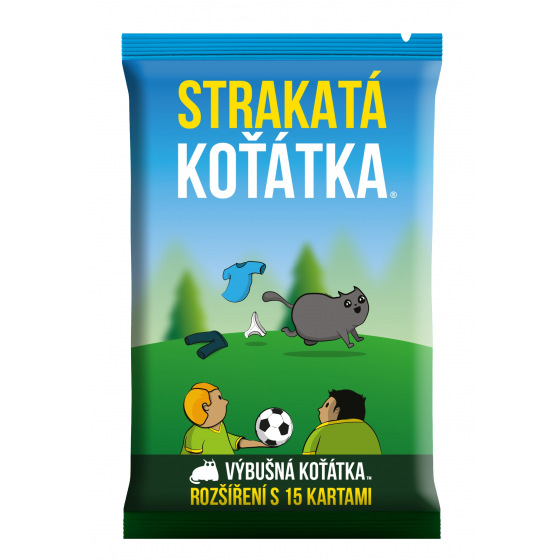 Přichází super várka nových karet do vaší oblíbené kočičí hry! Těšit se můžete třeba na ultimátní Prokletí kočičí prdelky, které zbavuje jednoho hráče možnosti dívat se na své karty. Hlavním vlajkonošem této edice je zajisté Strakaté koťátko a jeho super schopnost držení Výbušného koťátka v ruce. Potěšíme také milovníky pořádných výbuchů - Atomová bombajská kočka - s ní všechna sranda končí… Anebo ne? Strakatá koťátka obsahují 15 nových karet, které musíte mít!