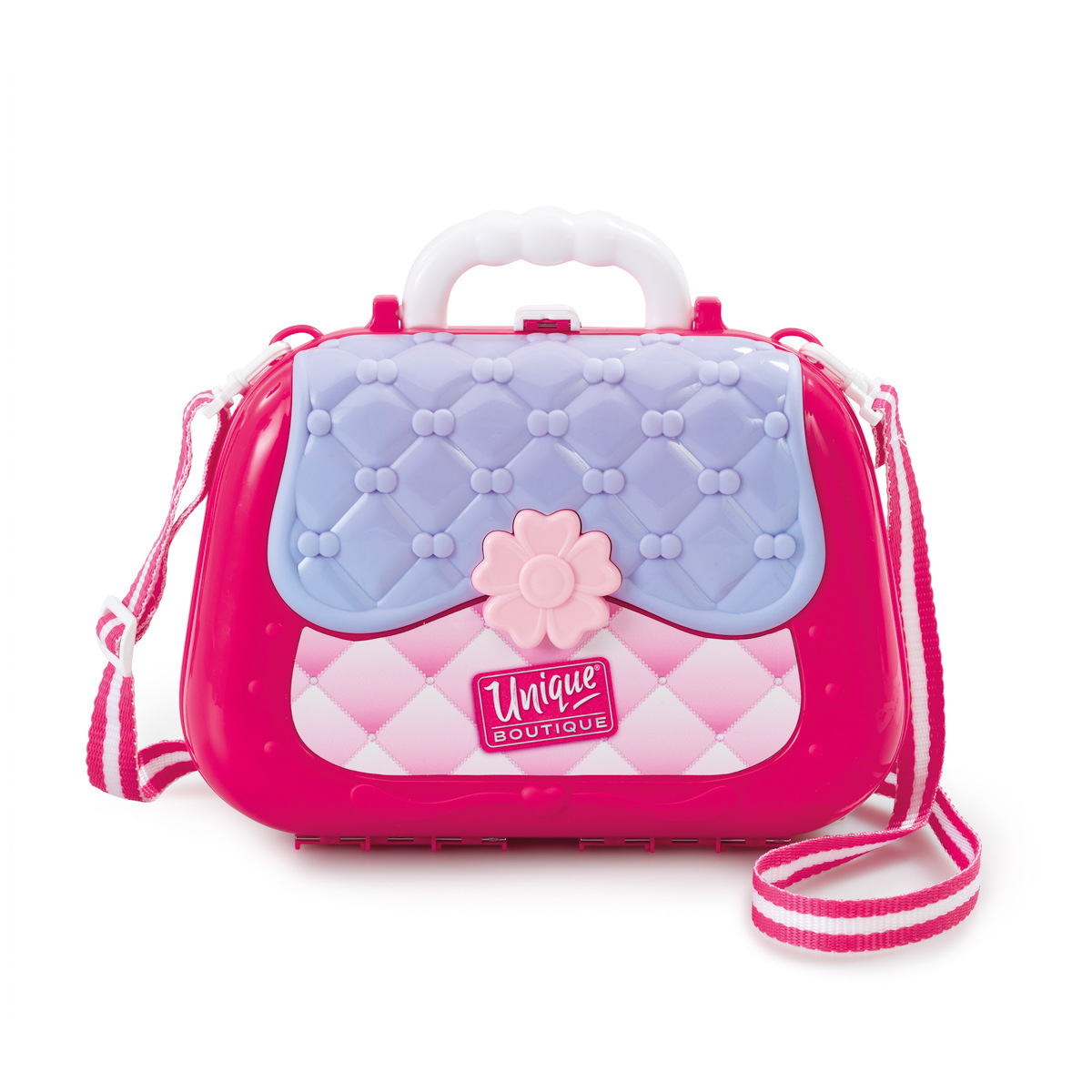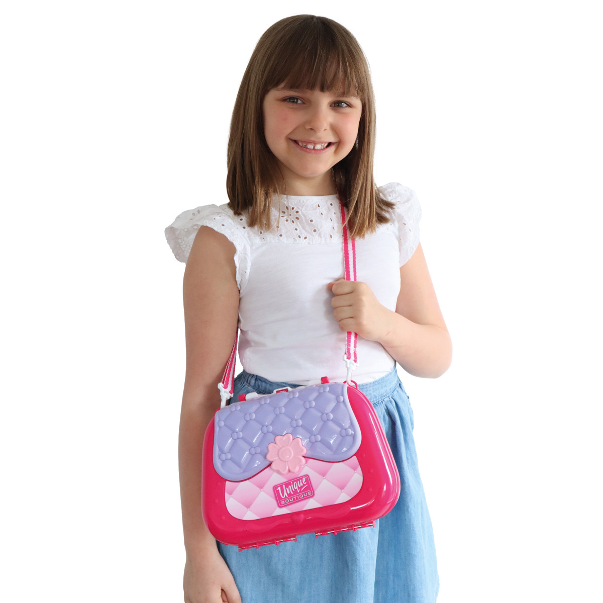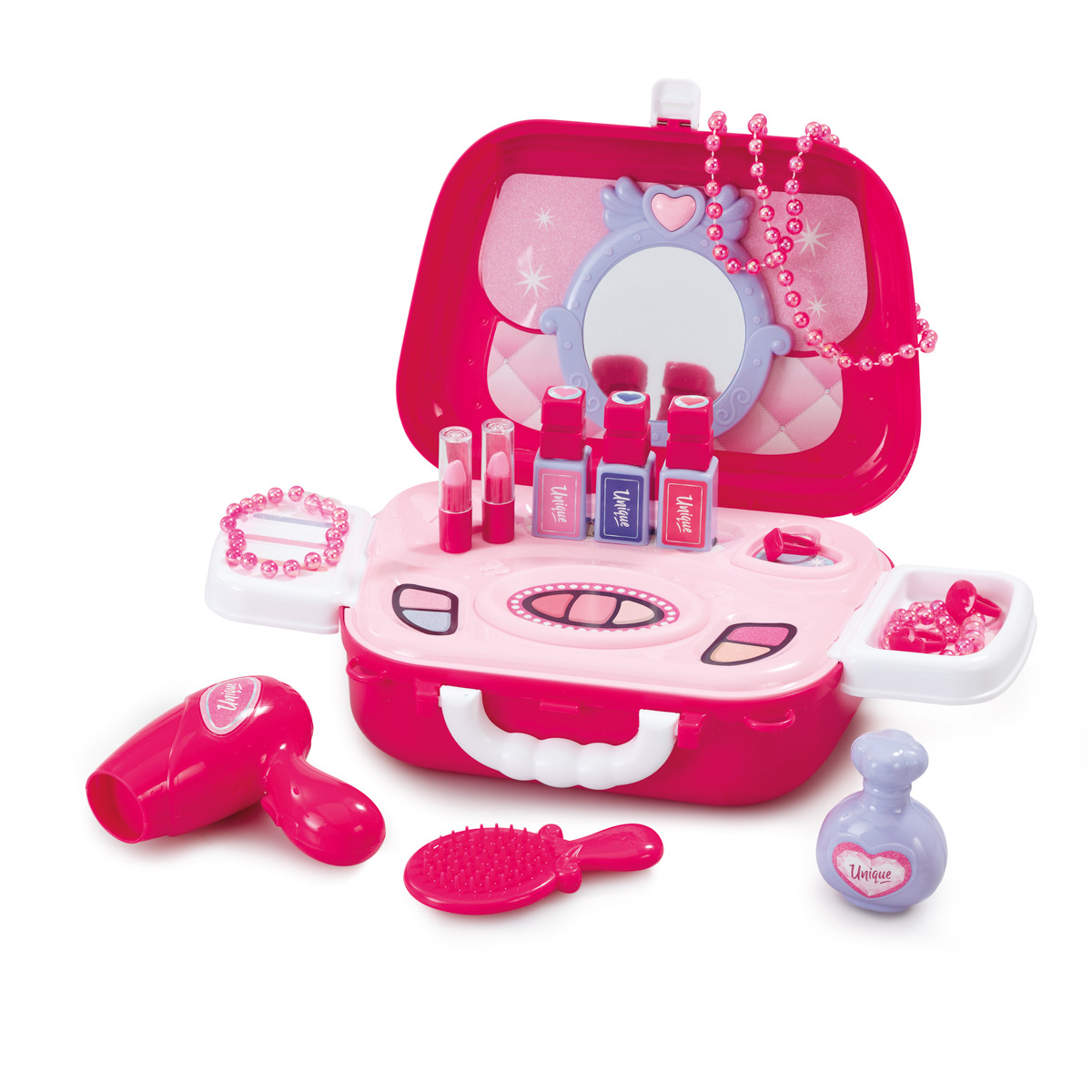 Připravme se na den s dokonalým kosmetickým setem. Noste toto robustní růžové pouzdro za rukojeť nebo jej noste se stylovým řemínkem na tělo a poté jej otevřete a odkryjte všechny jeho rozkošné doplňky. Pomocí předstíraného make-upu můžete hráty že nanášíte oční stíny, rtěnky a tvářenky. Vysušte a vykartáčujte si vlasy, nasaďte si náhrdelník, náramek a navlékněte prsteny. Poté svůj vzhled zakončete parfémem. Všechny kousky jsou napodobeniny, že jsou tak dokonalé pro holčičí zábavu! Toto roztomilé pouzdro je skvělé pro dobrodružství na cestách nebo ideální pro domácí hýčkání. Rozměry: 25x20x10cm. Věk: 3+