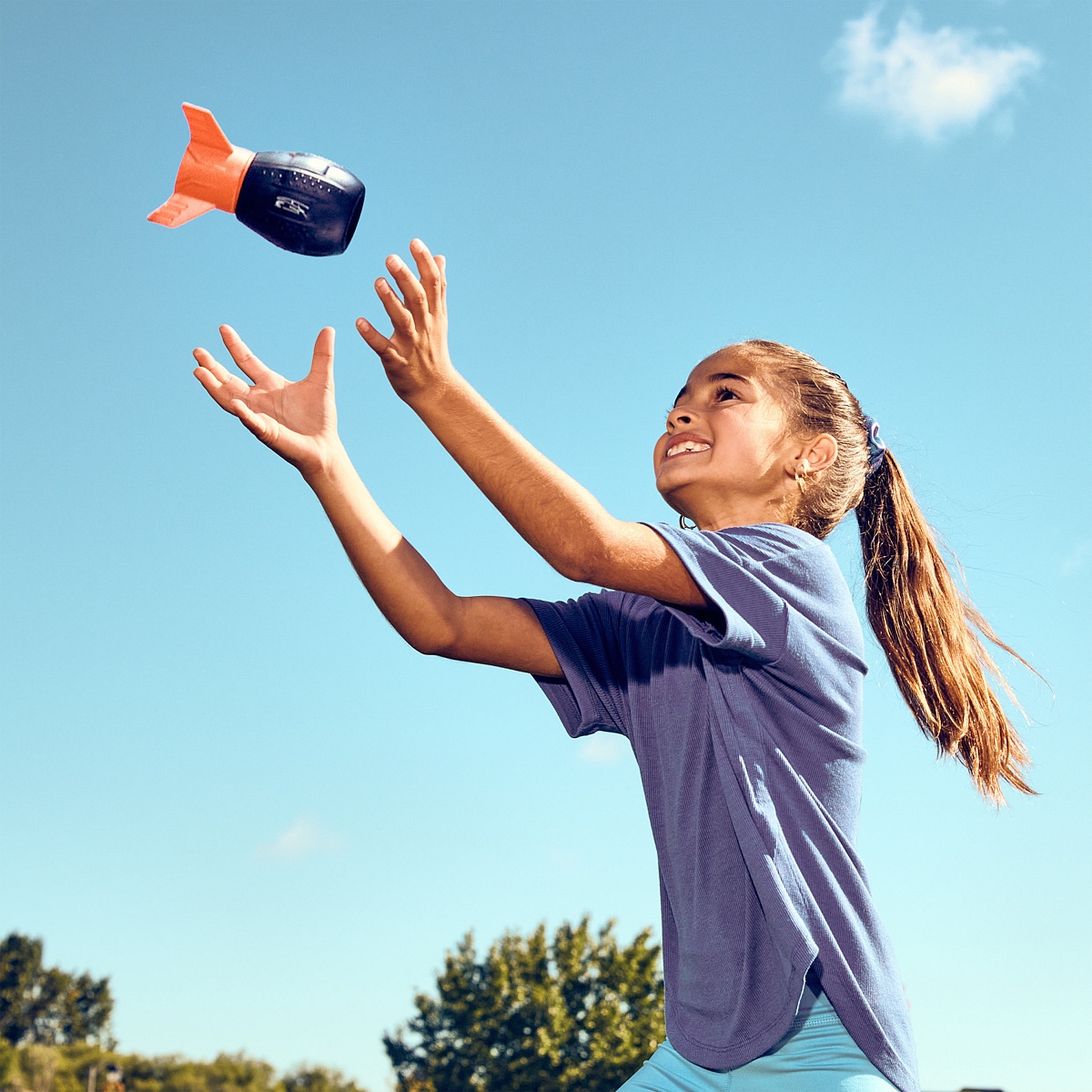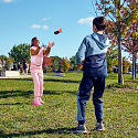 Házejte a chytejte jako profesionál s aerodynamickým americkým fotbalovým míčem Aerobie Super Sonic Fin Catch, který má malé rozměry a měkký pěnový materiál pro snadné chytání. Tento aerodynamický americký fotbalový míč/raketa, oficiálně schválený Russellem Wilsonem, quarterbackem týmu Denver Broncos, vám do rukou vloží sílu profesionála. Inovativní dutá gyroskopická konstrukce umožňuje aerodynamický let. Díky zábavnému tvaru amerického míče a přesnému vyvážení je s míčem Super Sonic Fin Catch snadné házet a chytat jako váš oblíbený quarterback NFL. Natočte míč, zamiřte a pošlete ho směrem ke svým spoluhráčům a sledujte, jak chytají. Super Sonic Fin Catch poskytuje nádherný spirálový hod a je ideální pro děti i dospělé. Skvěle se hodí pro zahradní hry, venkovní dětské a rodinné hry. Parádní modrý a oranžový design vynikne na zahradě, u bazénu nebo na pláži při vzrušujících hrách amerického fotbalu. Super Sonic Fin Catch je doporučen pro děti ve věku 8-14 let. Jazykové mutace: CZ, SK, E