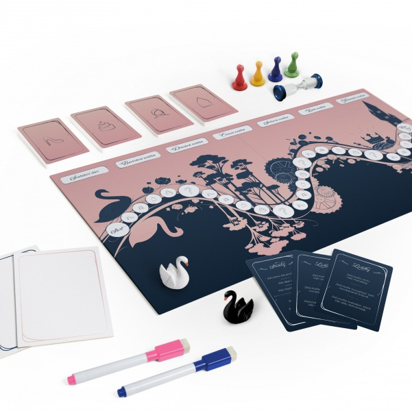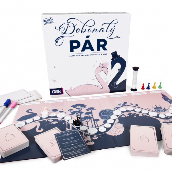 Hra Dokonalý pár obsahuje: herní plán, přesýpací hodiny, 2 mazací destičky, 2 fixy s mazátkem, 2 figurky labutí pro hru 2 hráčů, 4 figurky pro hru více hráčů, 2 žetony bot, 200 karet s úkoly a otázkami a pravidla.