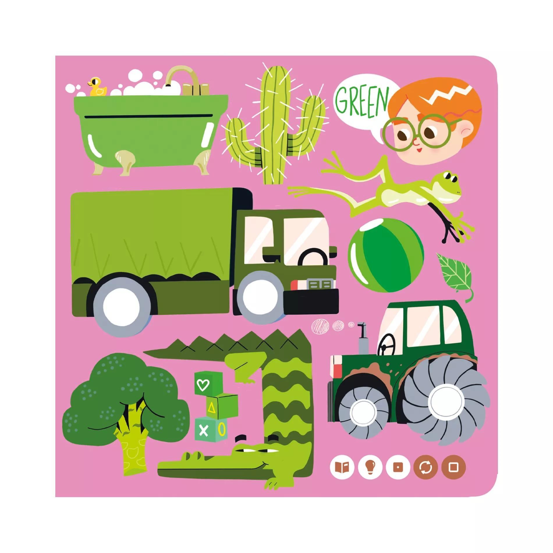 V knize My First Book of Colours z edice English with Ema and Albert se děti od 3 let naučí anglicky pojmenovat barvytvaryčíslahračkyzvířátkahudební nástrojedopravní prostředkyoblečení i předměty denní potřeby.
