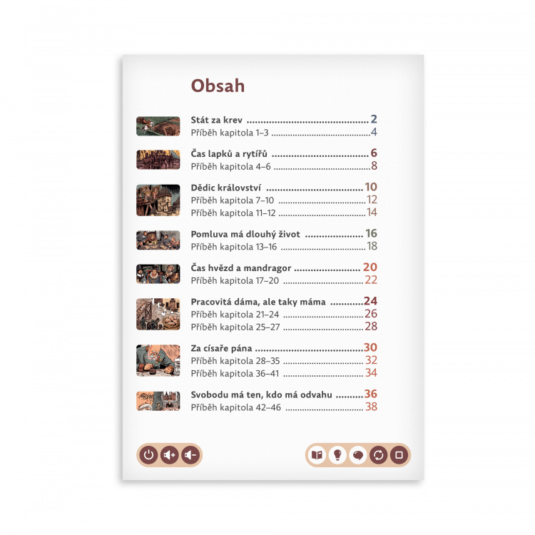 Tato moderní učebnice je učená všem chytrým školákům, kteří se chtějí zábavnou formou seznámit s předmětem vlastivěda. Přináší dětem přehledný pohled na historii českého státu. Výklad dějin je doplněn dobrodružným příběhem tří dětí, které se podle staré listiny vydávají na cestu, kterou musel projít každý budoucí český král. Na cestě měl splnit uložené úkoly a dokázat, že je titulu hoden. Hrdinové našeho příběhu se pokusí cestu projít a úkoly vyřešit. Připojte se k nim a ponořte se do světa napínavého úpříběhu českých dějin.