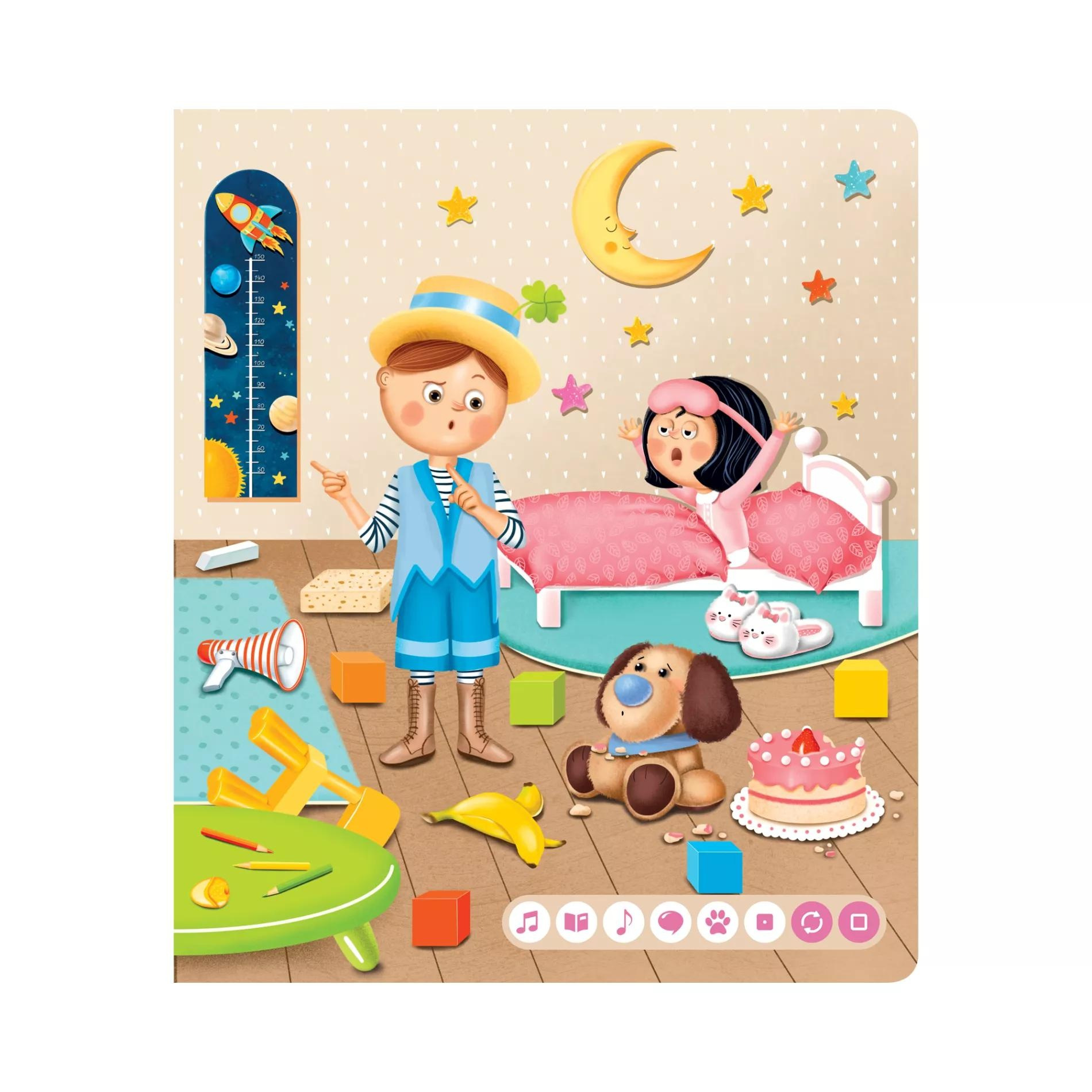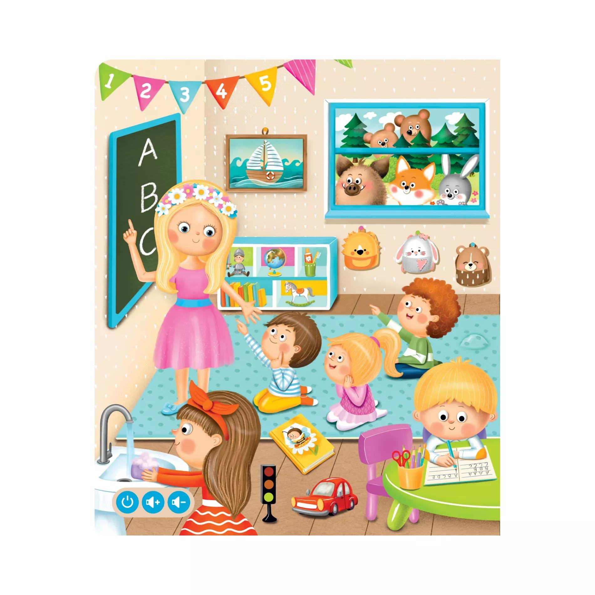 Mluvicí kniha je určena pro nejmenší děti od 3 let, které se spolu s postavami podívají např. do školky, kde se naučí první písmenkačísla barvy. V parku u rybníka nakrmí kachny a zahrají si na hřišti. V pohádkovém lese pomohou kůzlátkům a nenaletí vlkovi. Podívají se i do divadla, kde poznají hudební nástroje. Dozví se, kdo žije pod zemí a co zdravého roste na zahradě. Čeká je i výlet zpátky v čase, kde potkají dinosaury, v tělocvičně si zasportují a nakonec navštíví farmu se zvířátky.