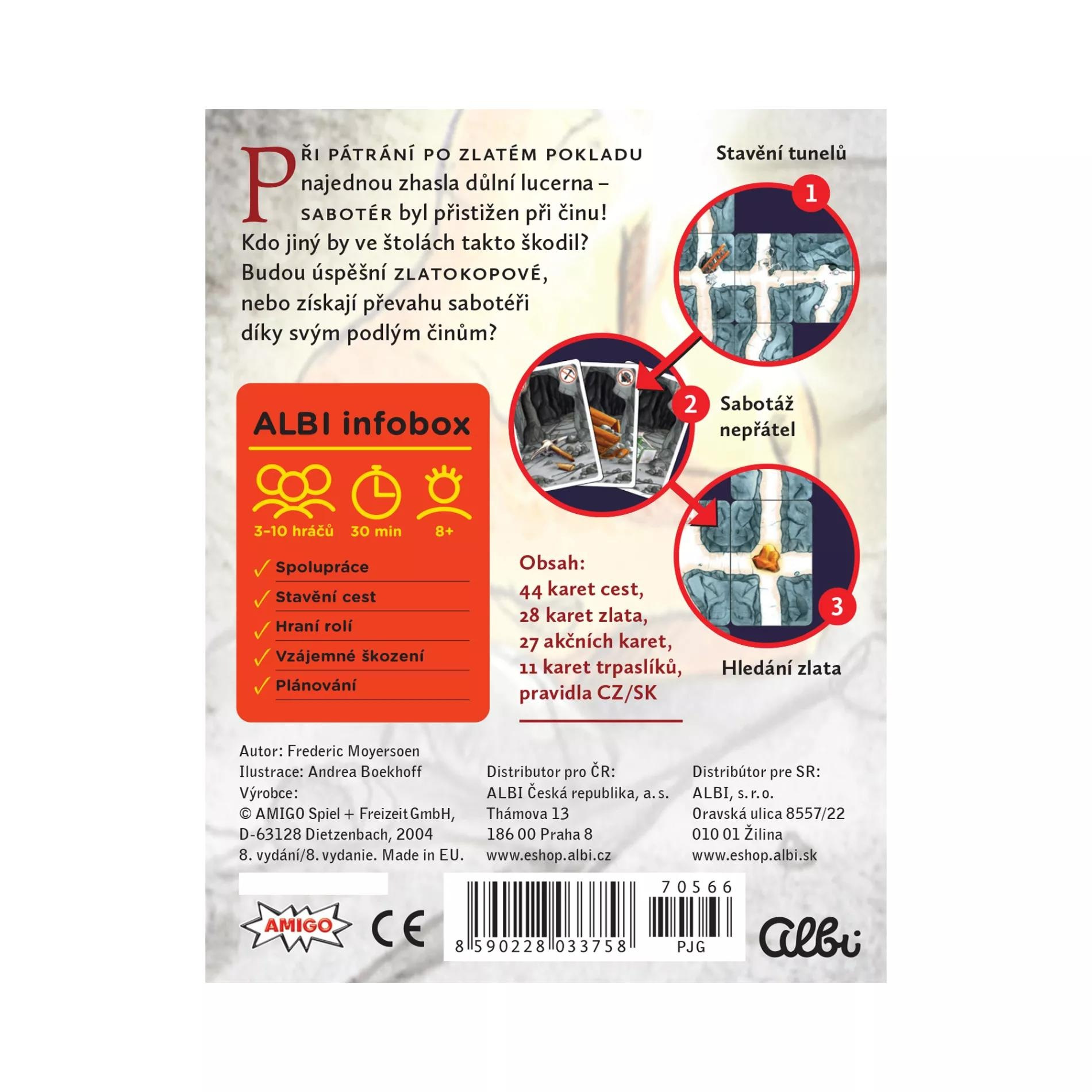 Hra Sabotér obsahuje: 44 karet cest, 28 karet zlata, 27 akčních karet, 11 karet trpaslíků a pravidla.