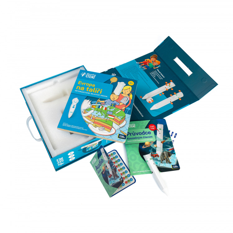 Sada Albi tužka 2.0 s knihou Evropa na talíři obsahuje: Elektronickou Albi tužku 2.0, knihu Evropa na talíři, Průvodce Kouzelným čtením, nabíječku, USB-C kabel, audio blok, 10 kusů samolepek MP3 přehrávače, 10 kusů samolepek ovládání hlasitosti.