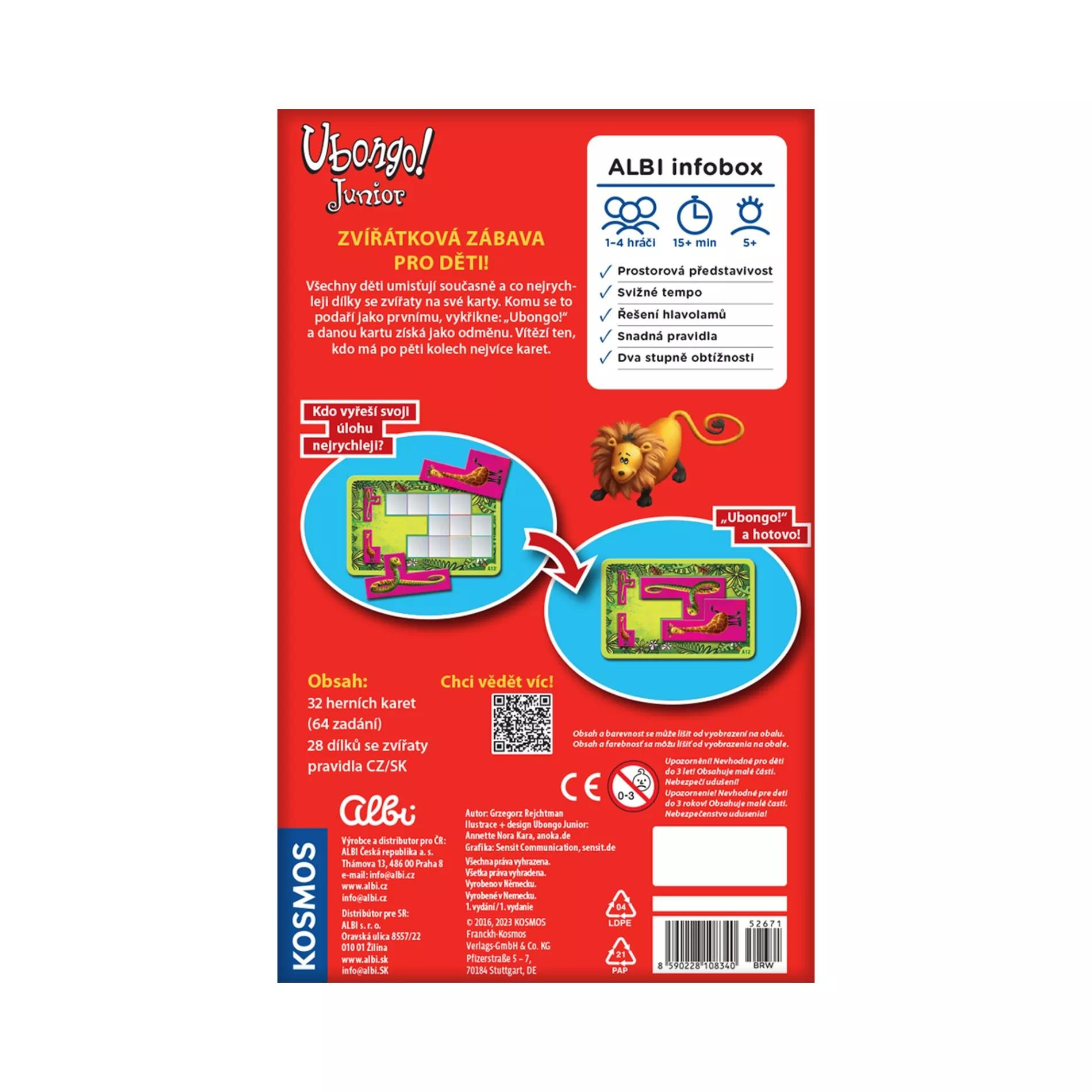 Zjednodušená verze hry Ubongo, kterou si můžete vzít kamkoliv sebou. Ve hře Ubongo Junior Mini se hráči snaží co nejrychleji umístit dílky se zvířátky na určené pole na herní kartě.