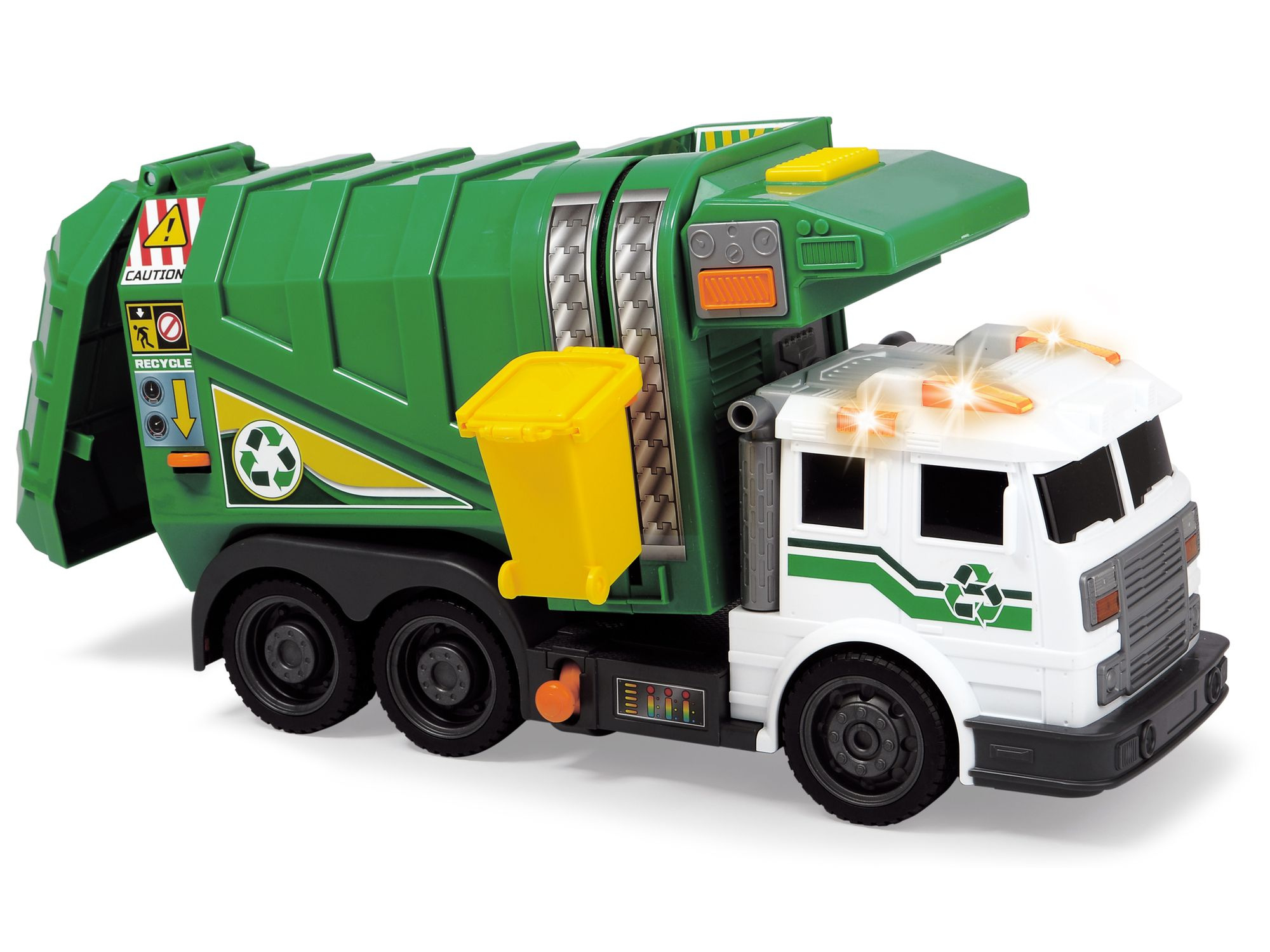 Popelářské auto zelené na volnoběh vč. popelnice. Zvukové a světelné efekty, sklopná násypka, otevírací zadní panel. Délka 39 cm.