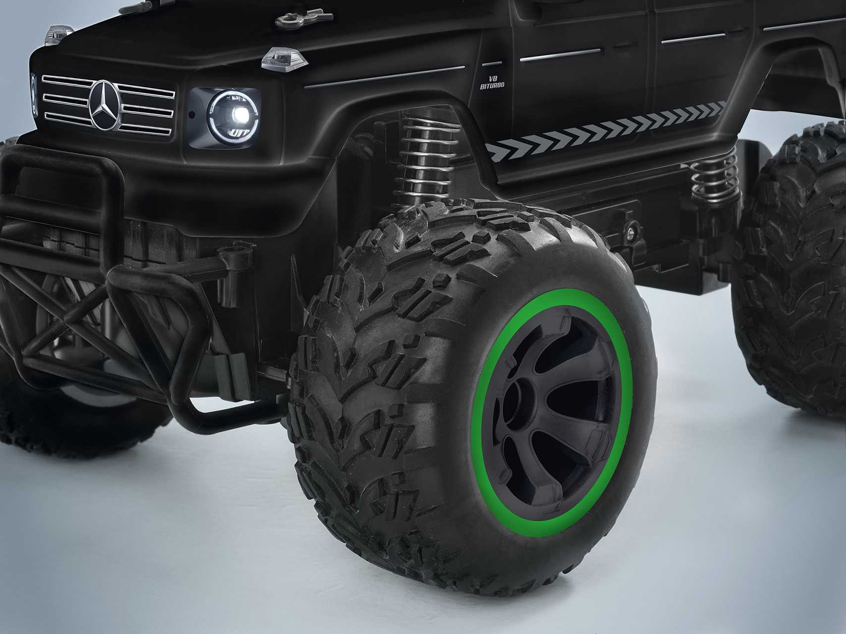 - RC Monster Truck 1:18 s velkými pneumatikami - Kovové převody a Li-Ion baterie - Vhodný pro použití v terénu a odolný proti cákání vody - S licencí Mercedes-Benz