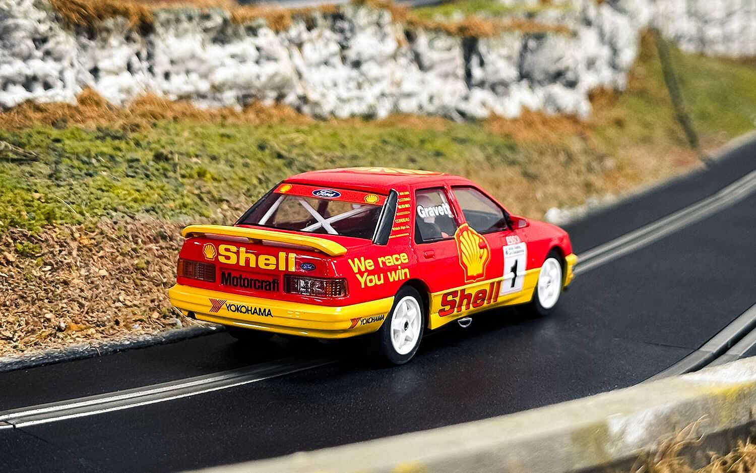 Scalextric zachycuje dramatičnost závodů cestovních vozů z počátku 90. let prostřednictvím modelu Ford Sierra Sapphire, s nímž v roce 1990 v seriálu BTCC závodil Rob Gravett. Tento model v nápadném červeno-žlutém zbarvení představuje éru, kdy britský vrcholný motoristický šampionát charakterizovala surová síla a dominance vozů s pohonem zadních kol.