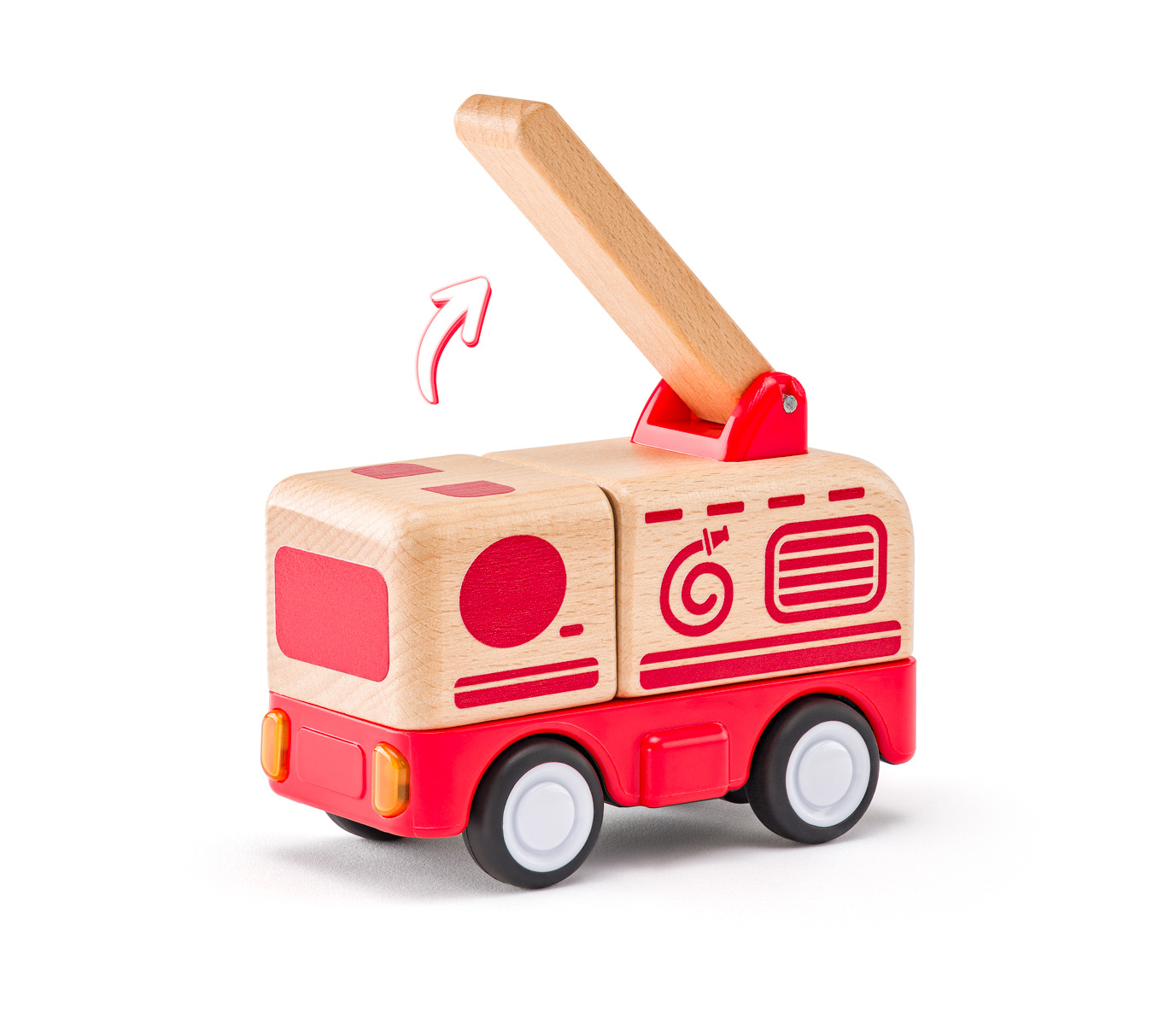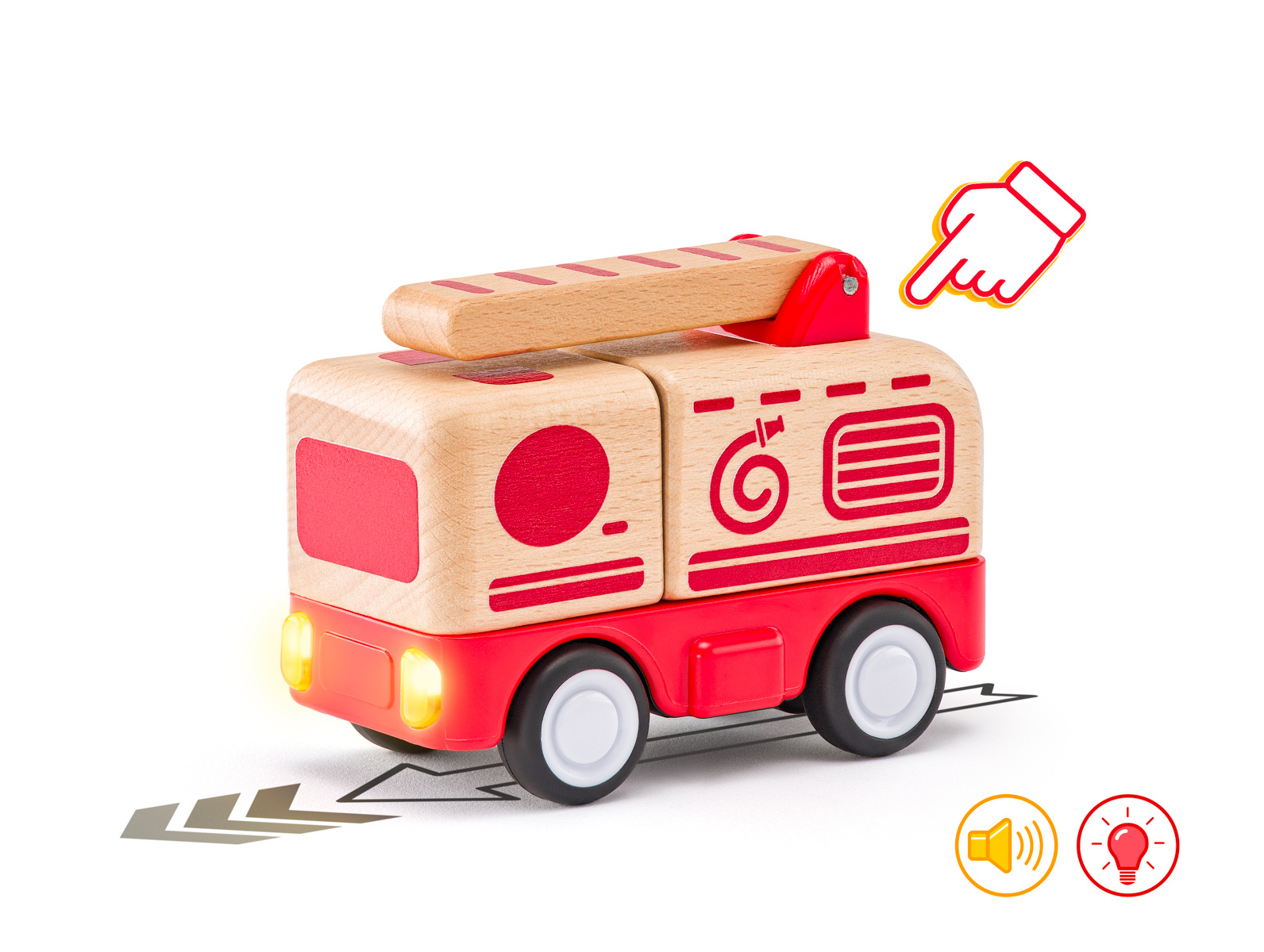 Autíčko se setrvačníkem je vyrobeno z pevného masivního dřeva a je určeno přesně do malé dětské ruky. Je vybaveno světlem a zvukem. Žebřík na střeše autíčka je vyklápěcí.| Rozměr výrobku: 11 x 5,5 x 8,2 cm | Věk: 18m+, baterie 3 X LR44 1,5V jsou součástí