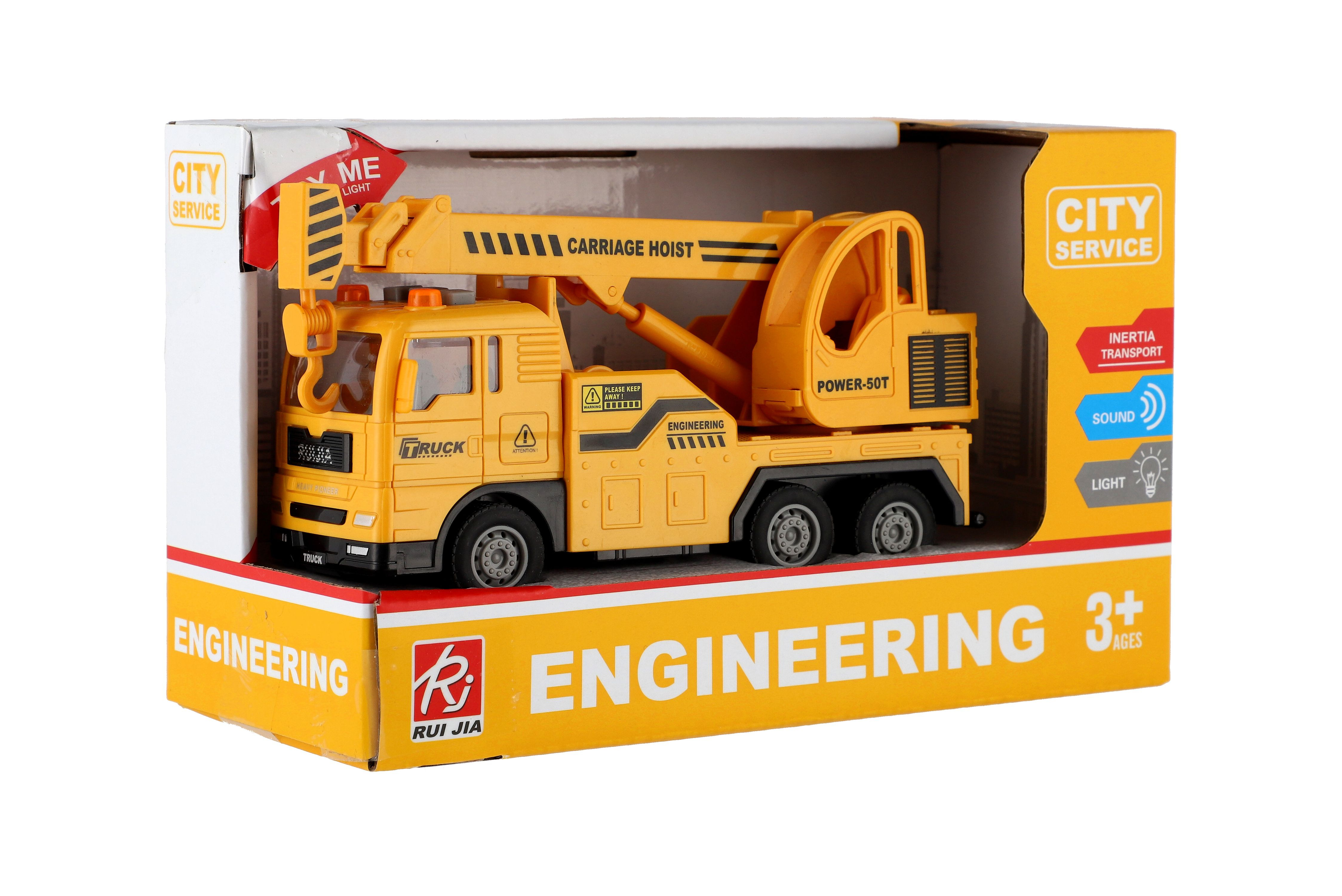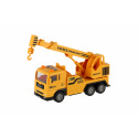 Popis Auto jeřáb plast 16cm na setrvačník na baterie se světlem se zvukem v krabici 21x13x9cm