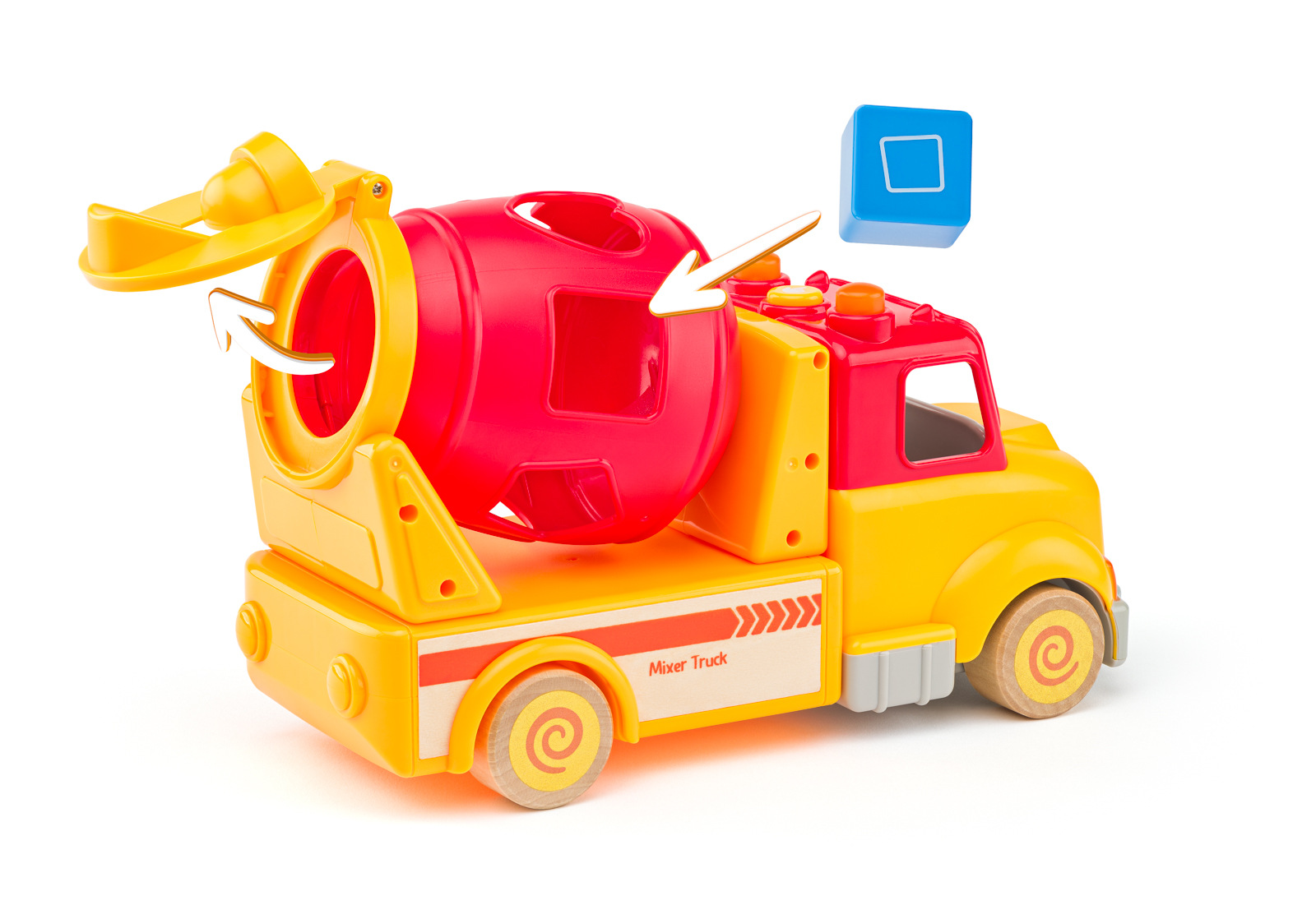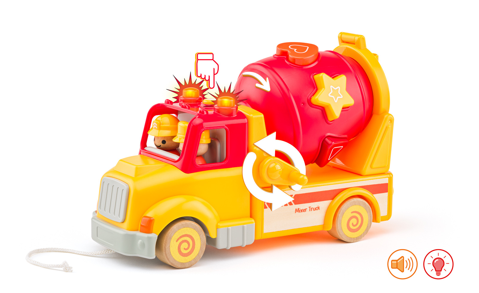 Míchačka je vyrobena v kombinaci kvalitního plastu a dřeva. Zmáčknutím tlačítka na kabině řidiče se aktivuje světlo a zvuk. Míchací nádrž s otvory na prostrkávání tvarů je vybavena zadními dvířky k rychlému vyprázdnění. Obsahuje 2 figurky popelářů.| Rozměr výrobku: 28 x 11,5 x 18 cm | Věk: 18m+, baterie 3 X LR44 1,5V jsou součástí