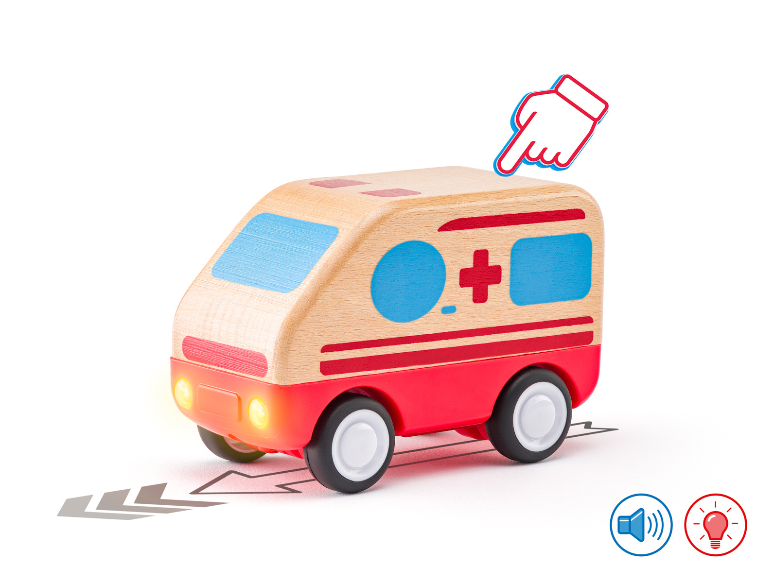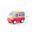 Sanitka je vyrobena v kombinaci kvalitního plastu a dřeva a obsahuje množství lékařského vybavení včetně rentgenu a figurek záchranáře a pacienta. Zmáčknutím tlačítka na kabině řidiče se aktivuje světlo a zvuk.| Rozměr výrobku: 23,5 x 11,5 x 14,3 cm | Věk: 18m+, baterie 3 X LR44 1,5V jsou součástí