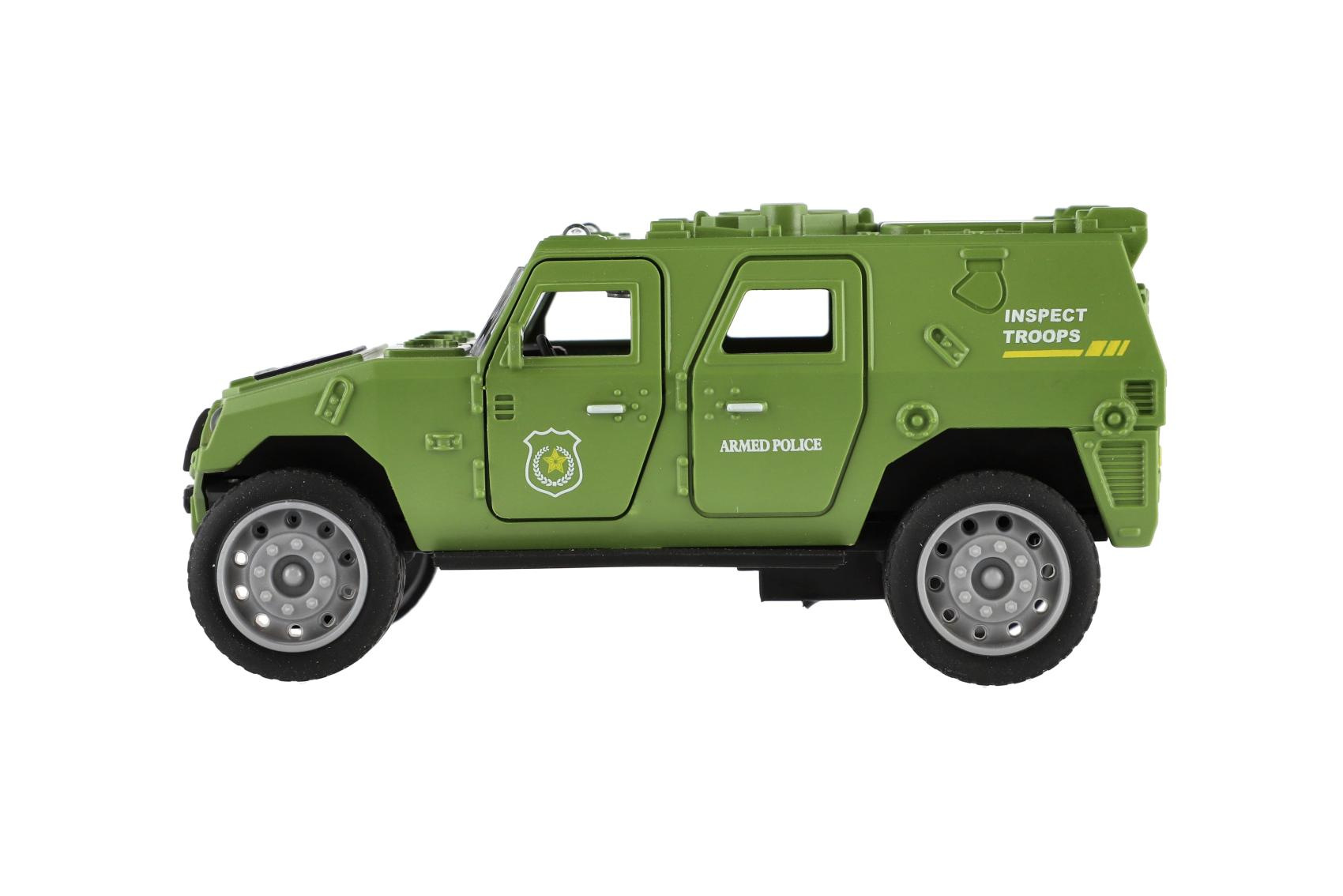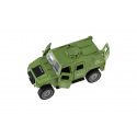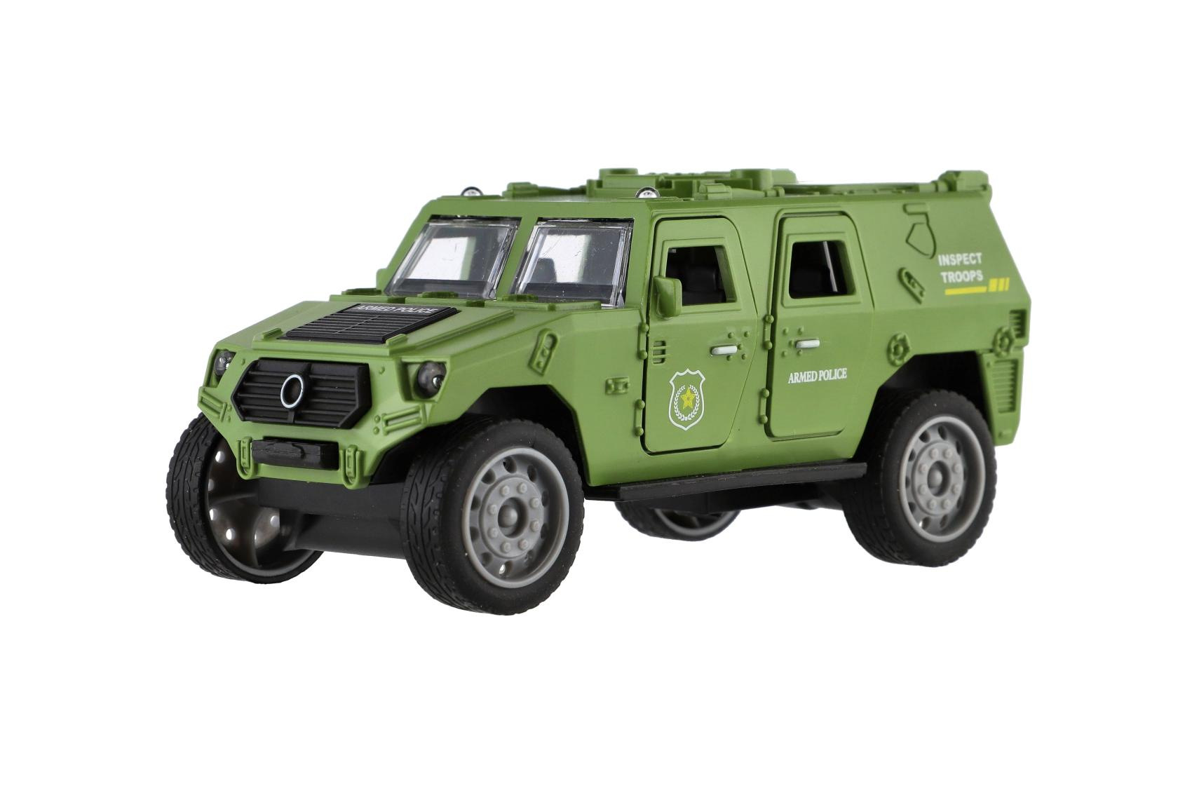 Vojenské auto o délce 13 cm je vyrobeno z odolného plastu a vybaveno mechanickým pohonem na setrvačník, který zajišťuje plynulý pohyb vpřed po natažení. Model v realistickém designu potěší všechny malé milovníky armádních vozidel a akčních scén. Balení obsahuje jedno auto v barevné dárkové krabičce, ideální také jako dárek.