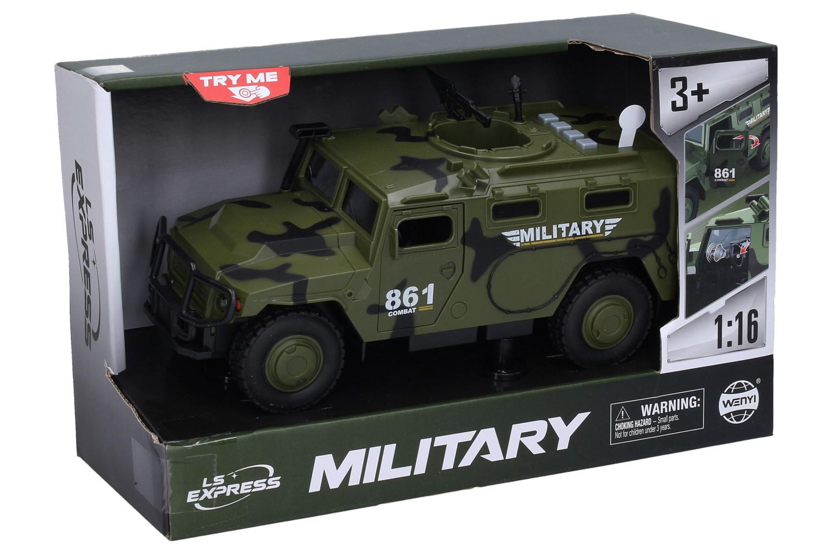 Auto vojenské plast 25,5cm na setrvačník na baterie se zvukem se světlem v krabici 30x19x13cm