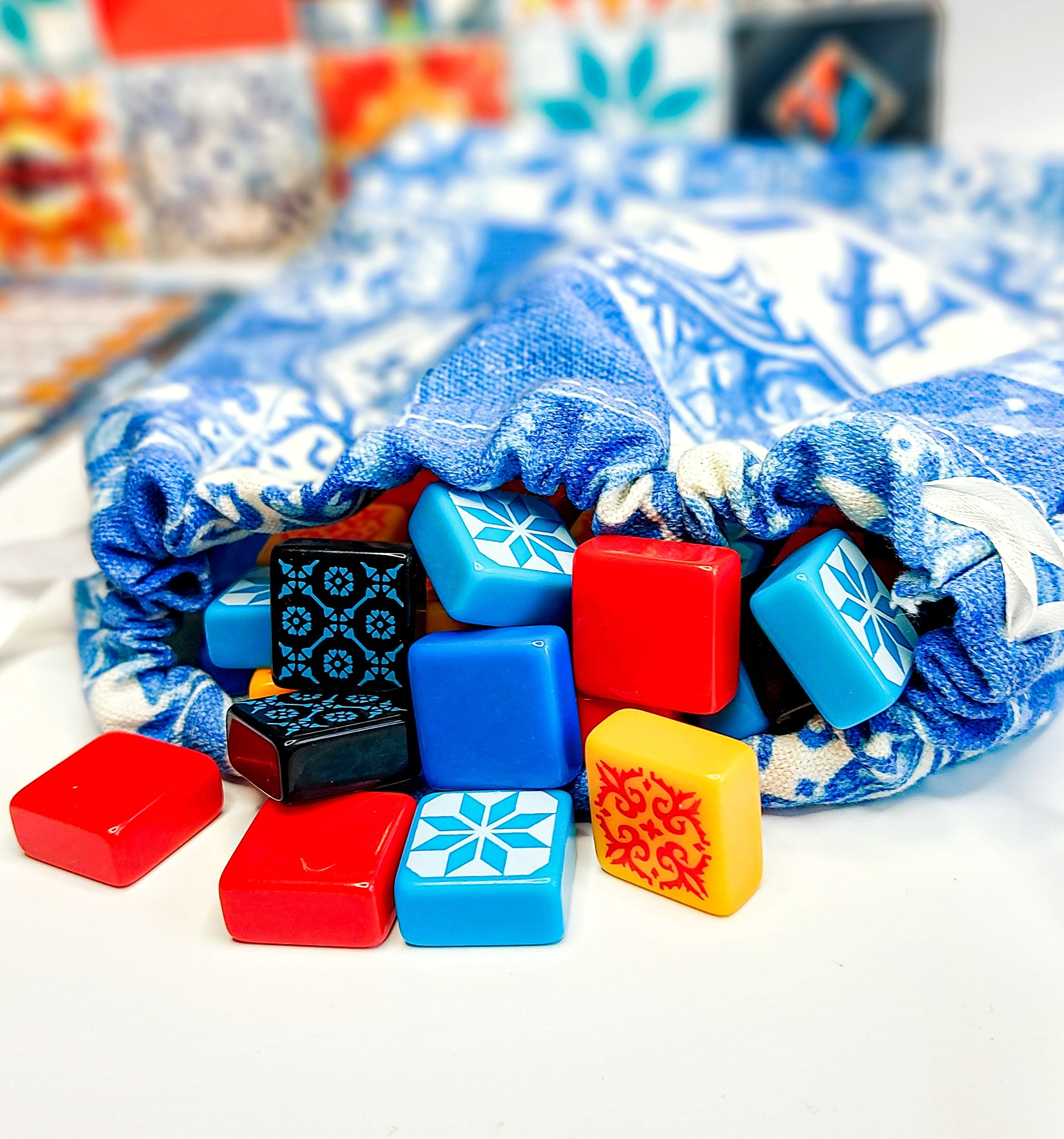 Obsah balení: 100 dílků dlaždic mozaiky 4 desky hráčů 9 kruhových výloh dílen 4 ukazatele bodů 1 žeton začínajícího hráče 1 plátěný pytlík 1 česká a slovenská pravidla