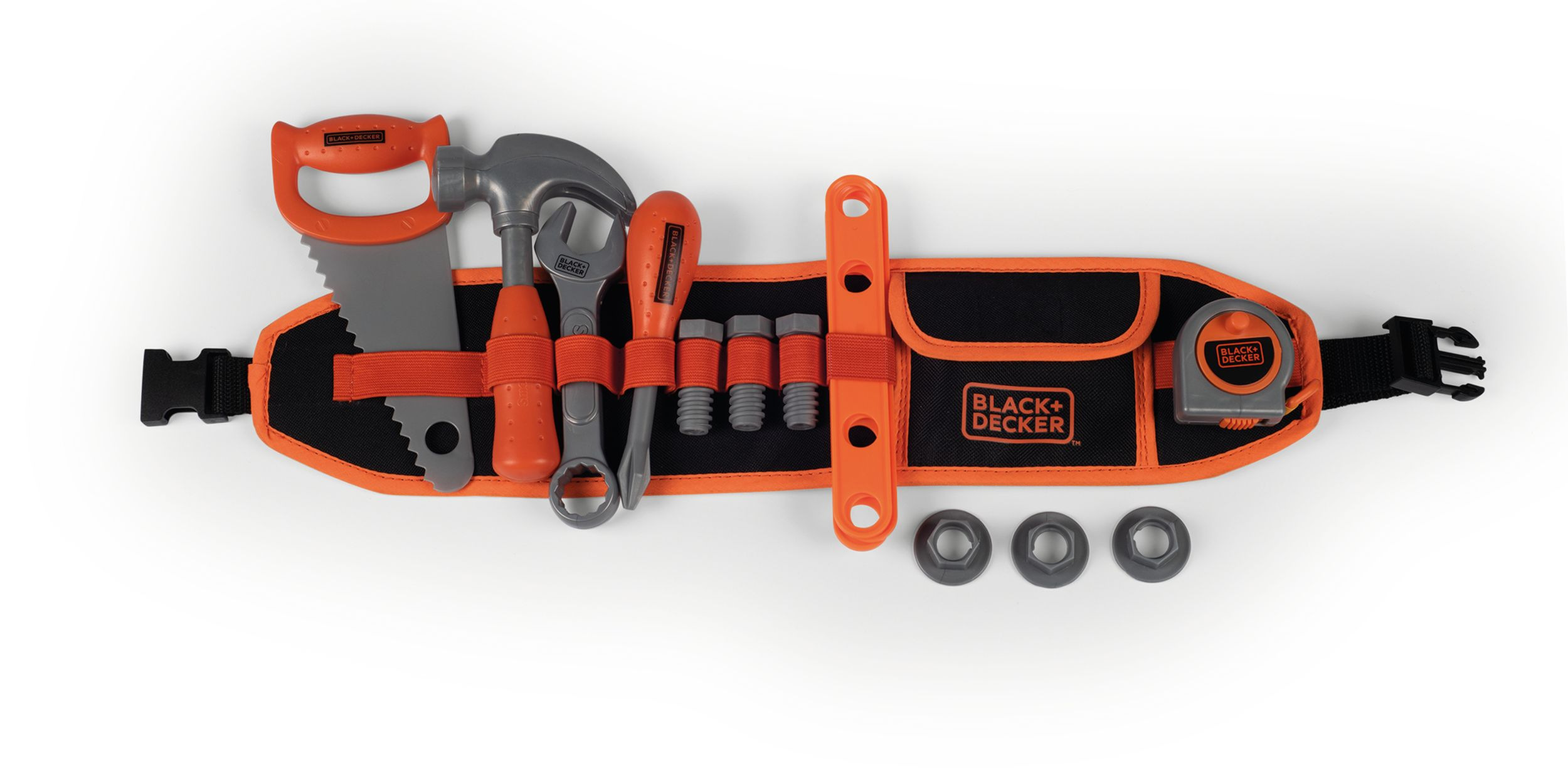 Opasek na nářadí s nastavitelným popruheh v licenci Black & Decker. Součástí 14 ks příslušenství: pila, šroubovák, kladivo, kombinovaný klíč, metr, 3 šrouby, 3 ploché spojky a 3 matice. S odkládací kapsou. Rozměry: 44 x 10 x 6 cm.
