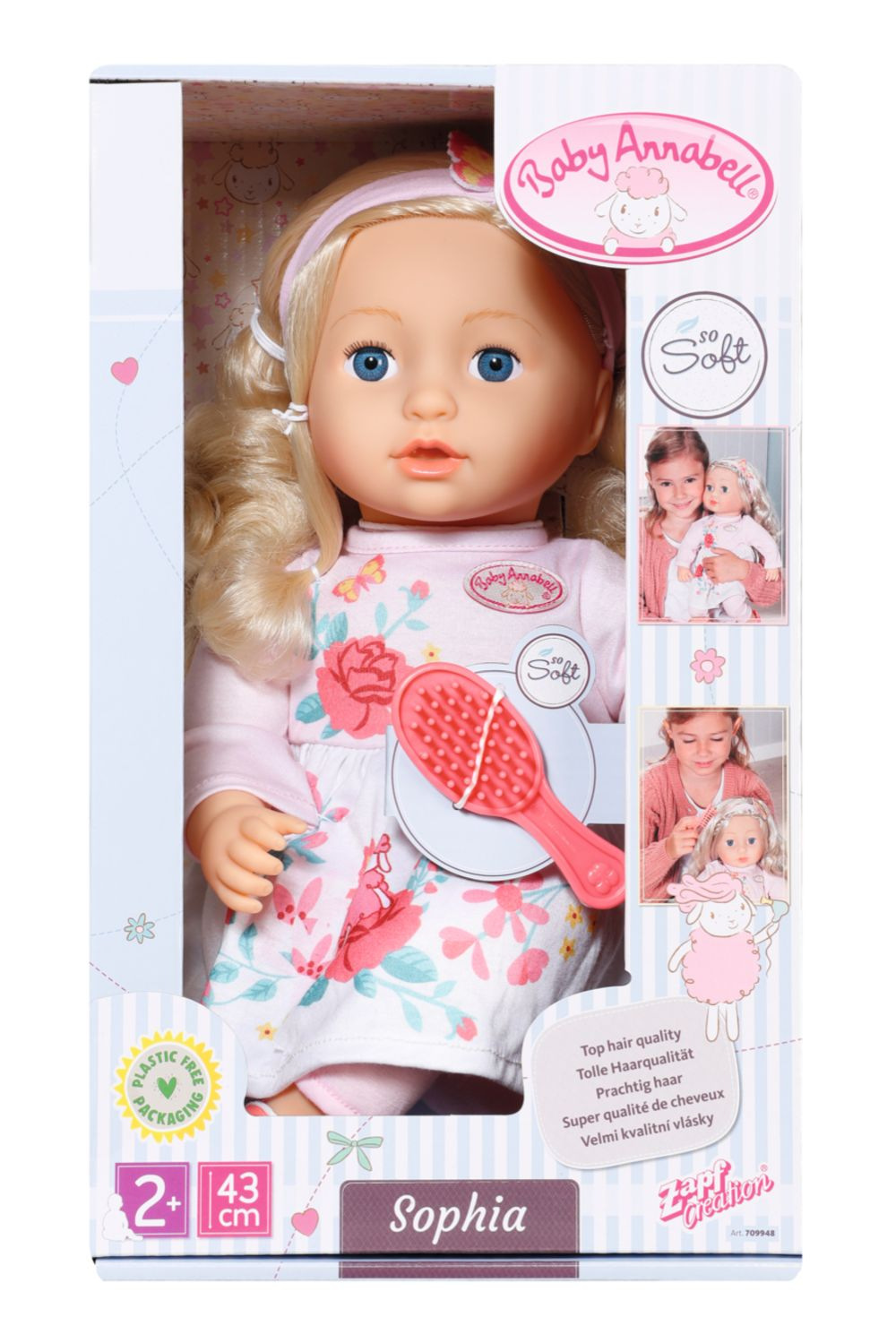 Baby Annabell Sophia je panenka velikosti 43 cm. Oblečena je do šatiček, legín a botiček. Součástí je čelenka a kartáč na vlasy.