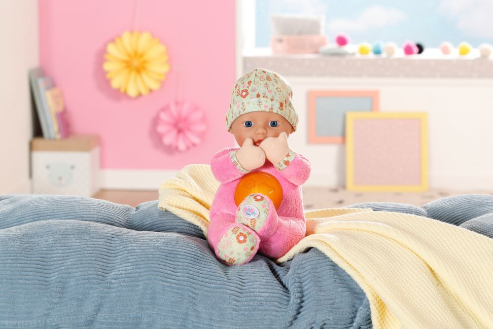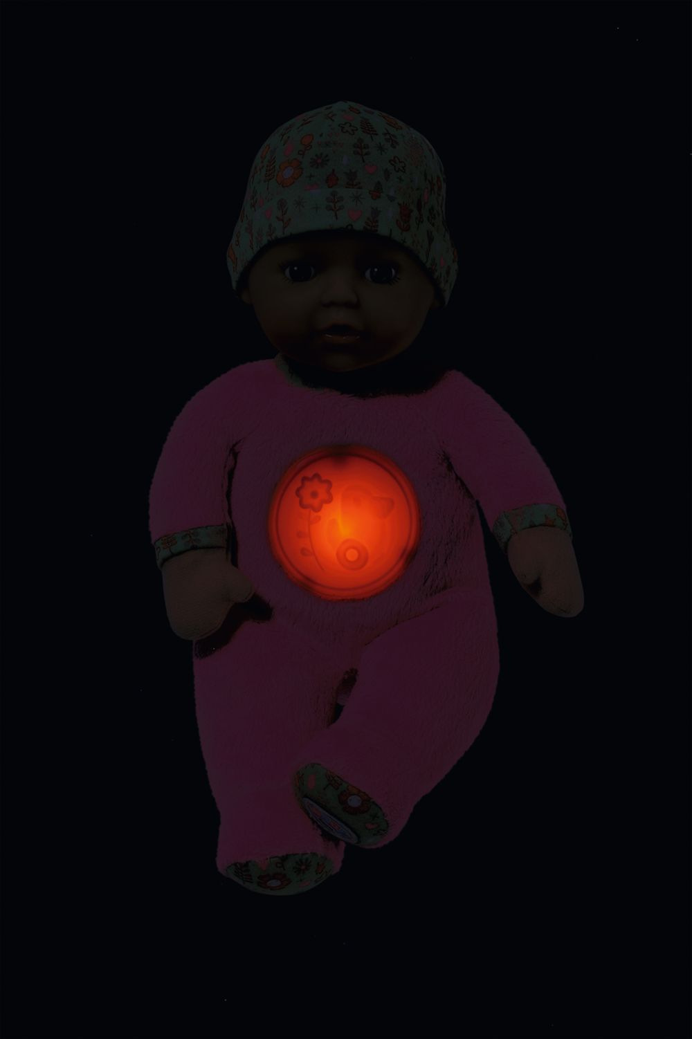 Díky rozkošné panence „Svítí ve tmě“ se z usínání stane dětská hra. Látkovou panenku velikosti 30 cm můžete umístit do kolébky nebo do dětské postýlky těch nejmenších dětiček už od narození. Má měkké tělíčko a rozkošné plyšové dupačky. Stisknutím kolečka na bříšku se aktivuje noční světýlko a rozezní se uklidňující melodie. Měkkou vinylovou hlavičku panenky chrání čepička s roztomilým potiskem. Různé textury materiálů na panence povzbuzují malé děti k hraní a objevování. A když se děti rozhodnou ručičku nebo nožičku panenky použít jako kousací kroužek, panenka se dá jednoduše vyprat v ruce, stačí z ní jen vyjmout zvukový modul.