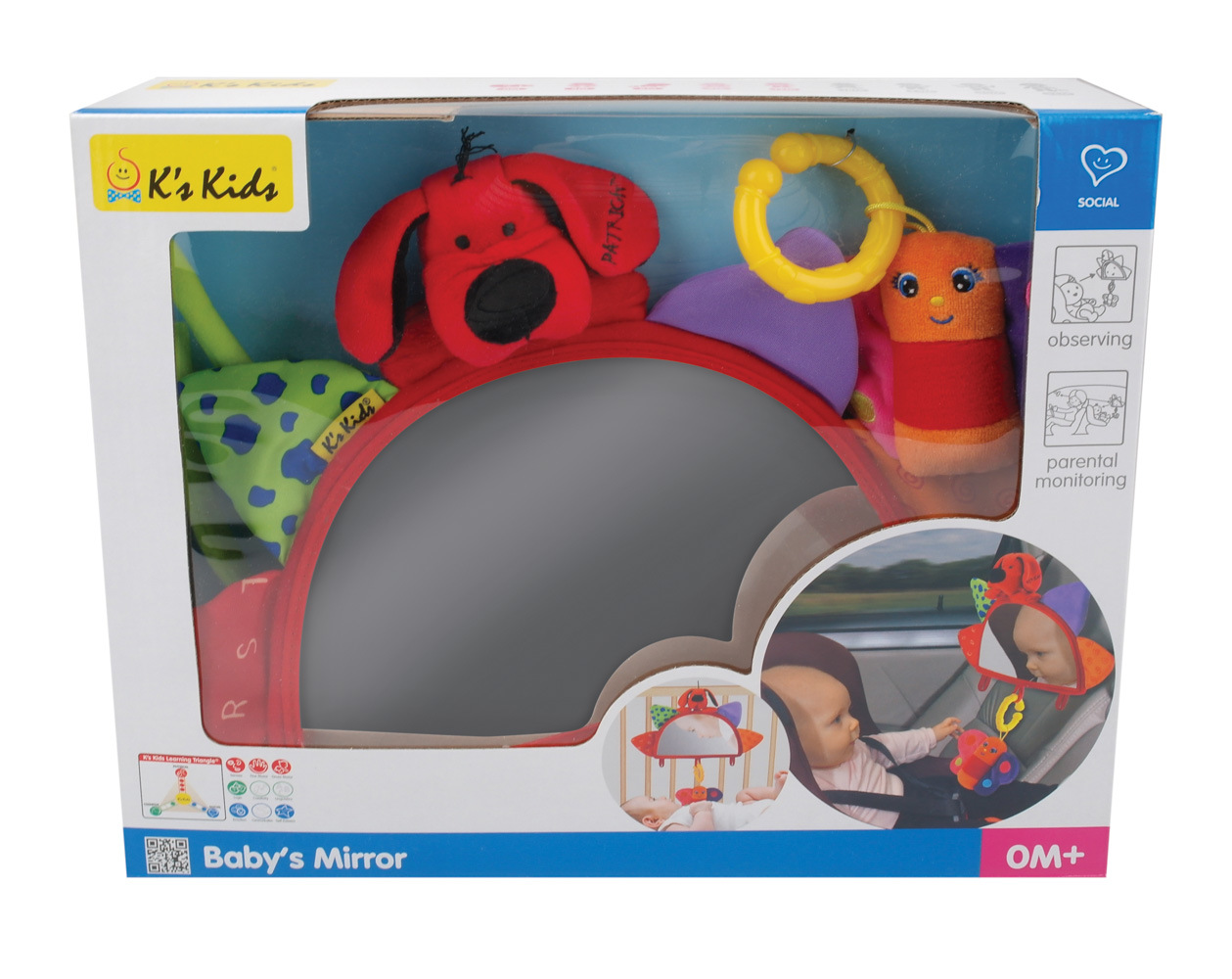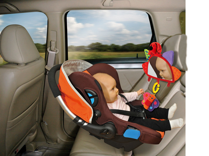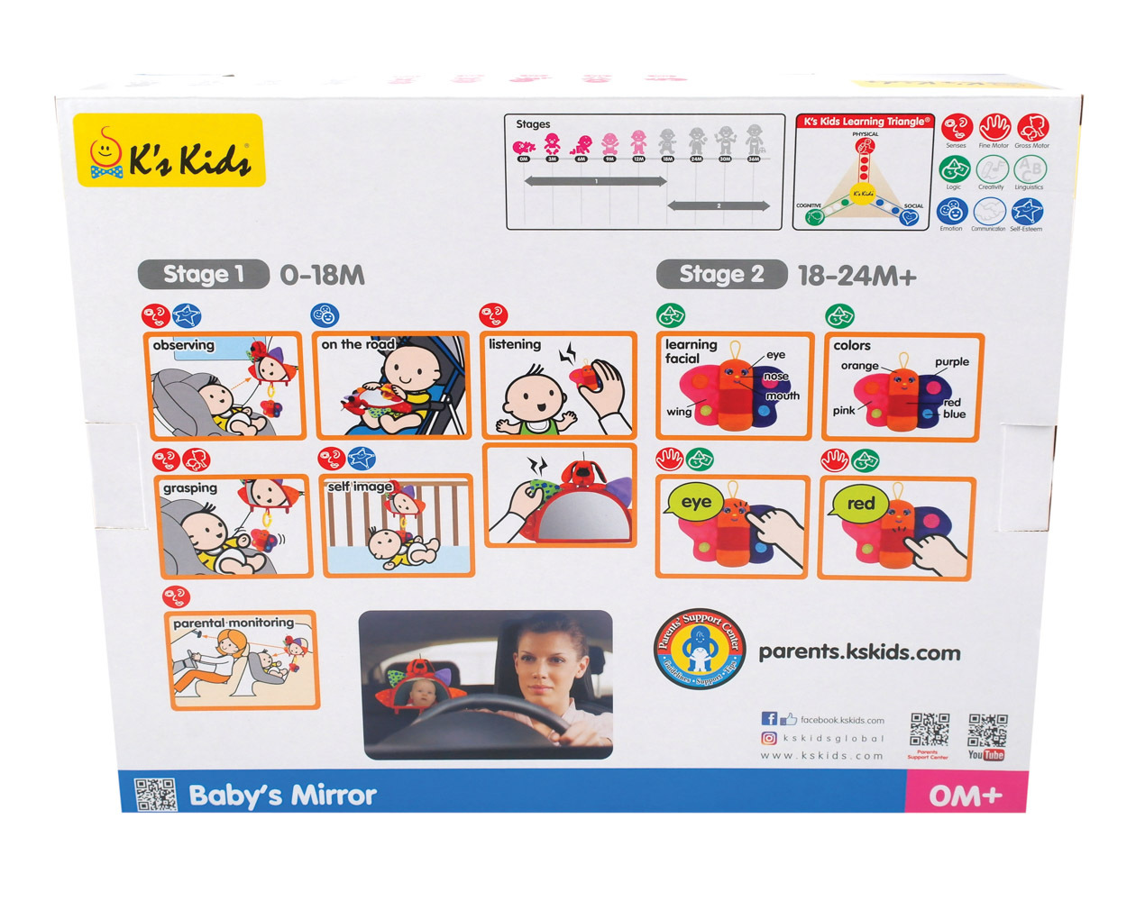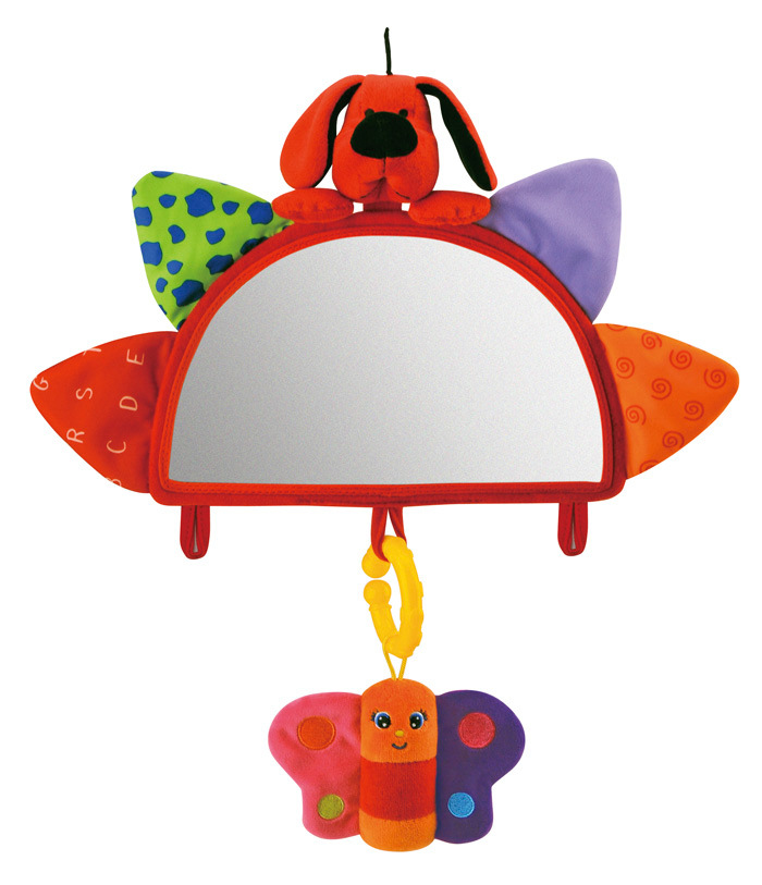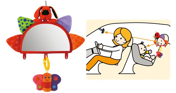 Nyní mohou mít děti v autě své vlastní zrcátko! Připevněte návlek k opěrce hlavy a vaše dítě se může pozorovat. Při cestování dětí v protisměru jízdy můžete s děťátkem udržovat oční kontakt. Součástí návleku se zrcátkem je závěsný motýlek, který se při jízdě pohybuje, vydává zvuk a povzbuzuje děti k tomu, aby jej uchopily. Hračku lze připevnit k postýlce i na kočárek. Rozměr zrcadla cca: 21,5 x 12,5 cm. Rozměr balení: 45 x 4 x 45 cm. Věk: 0+