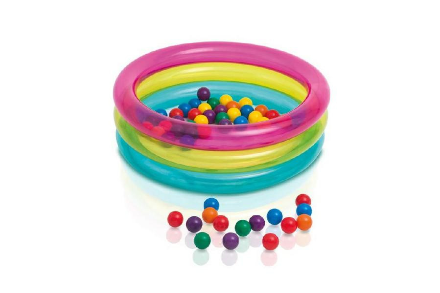Barevný tříkomorový nafukovací bazének přemění každou zahrádku na malé koupaliště. Rozměr 86x25 cm.