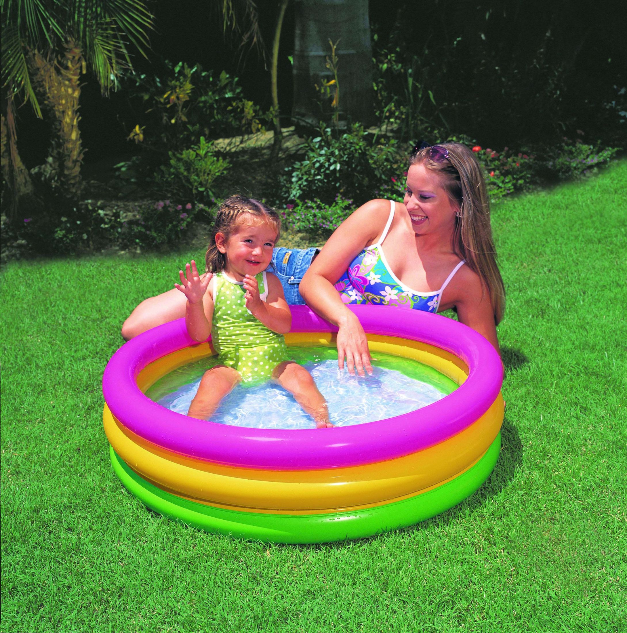 Barevný tříkomorový nafukovací bazének přemění každou zahrádku na malé koupaliště. Rozměr 86x25 cm.