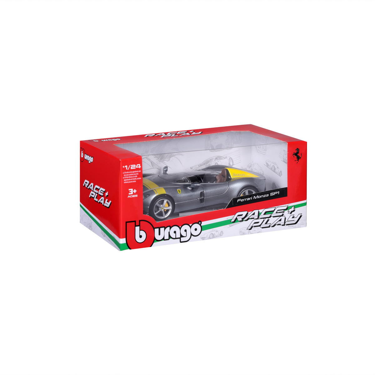 Modely automobilů Ferrari v měřítku 1:24 z kolekce RACE+PLAY jsou sbírkou krásného designu s vysokým důrazem na přesnost detailů. Modely jsou vyrobeny z litého kovu s plastovými detaily. Většina modelů z kolekce má otevírací dveře, kufr nebo kapotu. Některé z modelů mají pohyblivý volant. Baleno v krabičce. Nevhodné pro děti do 3 let. Rozměry balení: 10,3 x 25 x 12,6 cm. Věk: 3+