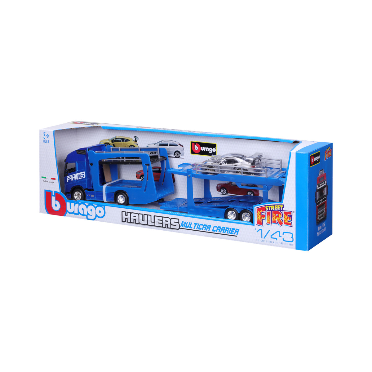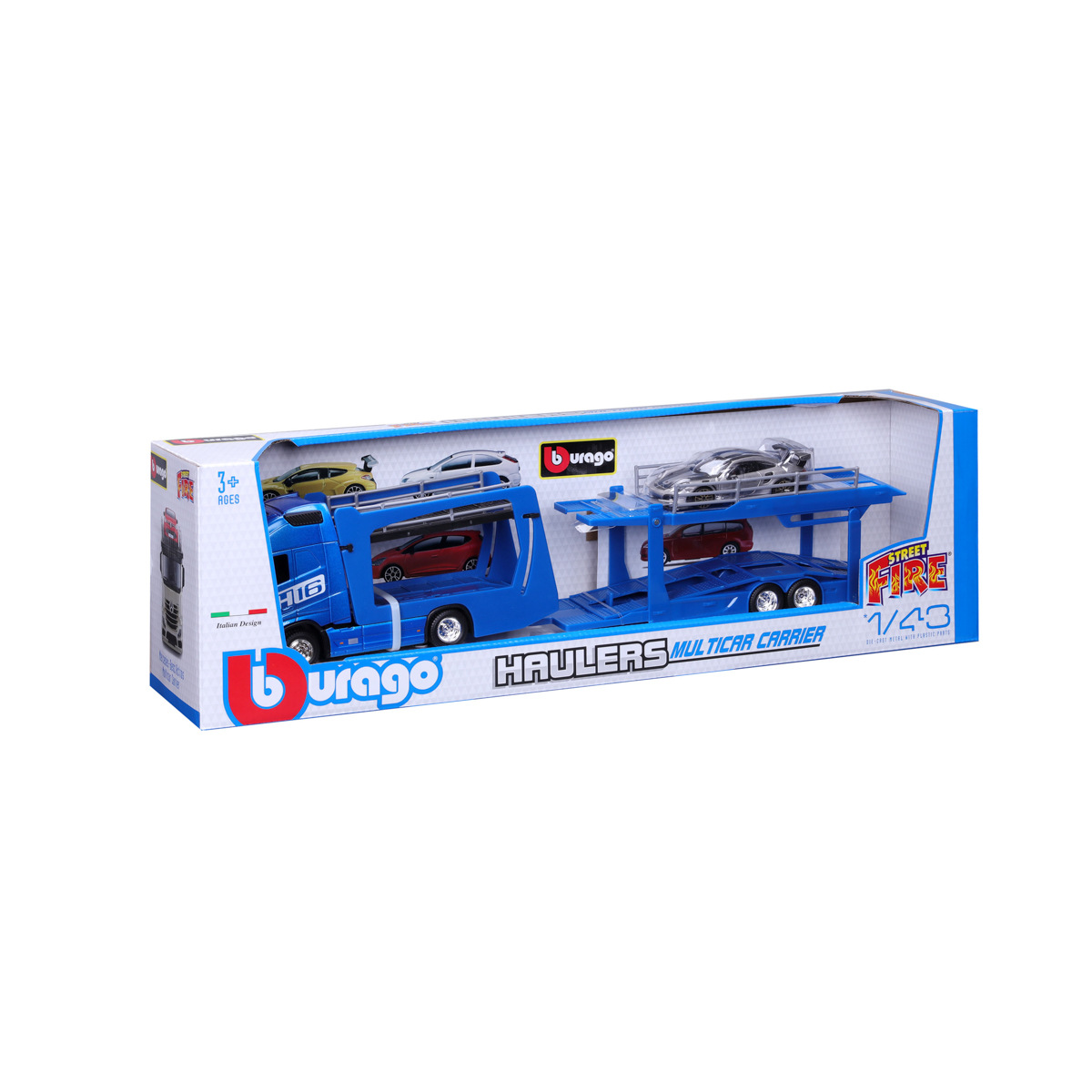 Modely kamionů v měřítku1:43 Multicar Carrier s návěsem pro přepravu aut z kolekce Street Fire jsou sbírkou modelů s vysokým důrazem na přesnost detailů. Modely jsou vyrobeny z litého kovu s plastovými detaily. Každý z kamionů je doplněn jedním modelem osobního automobilu. V přepravním návěsu mohou malí řidiči převážet až pět autíček z kolekce Street Fire. Baleno v krabičce. Nevhodné pro děti do 3 let. Rozměry balení: 15,5 x 52,1 x 11,8 cm. Věk: 3+