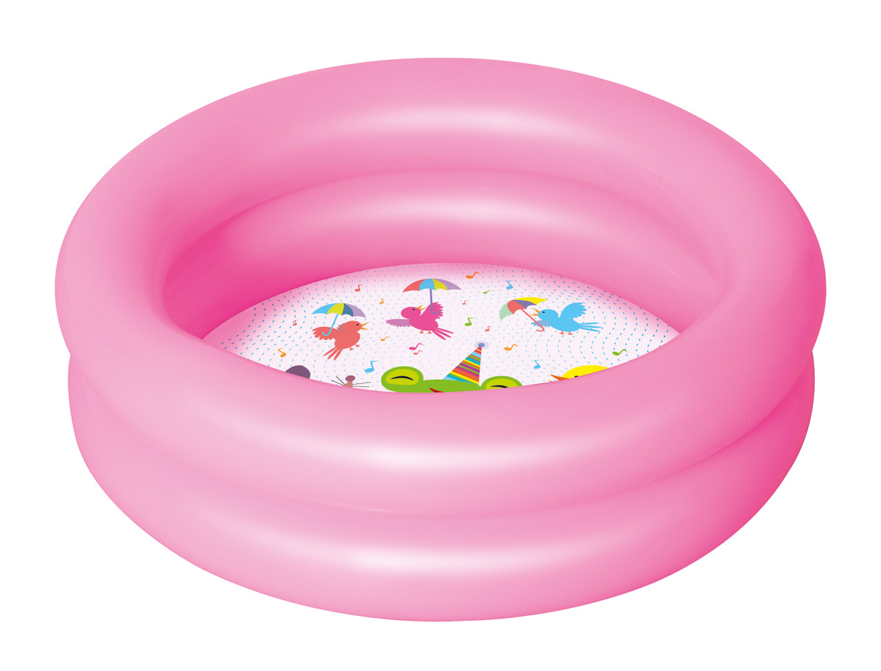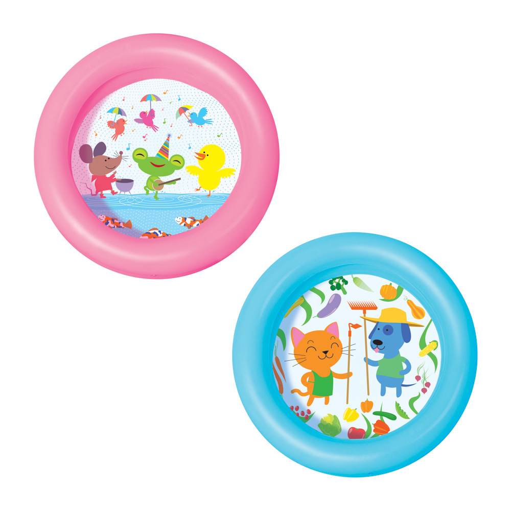 Nafukovací bazének s veselými obrázky na podlaze. Bazén má 2 barevné prstence v pastelových barvách. V nabídce ve dvou barevných provedeních ( růžová/modrá). Max. kapacita vody: 21 L. Rozměr: 61x15 cm. Věk: 2+(pod dohledem dospělé osoby).