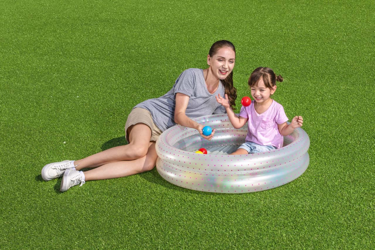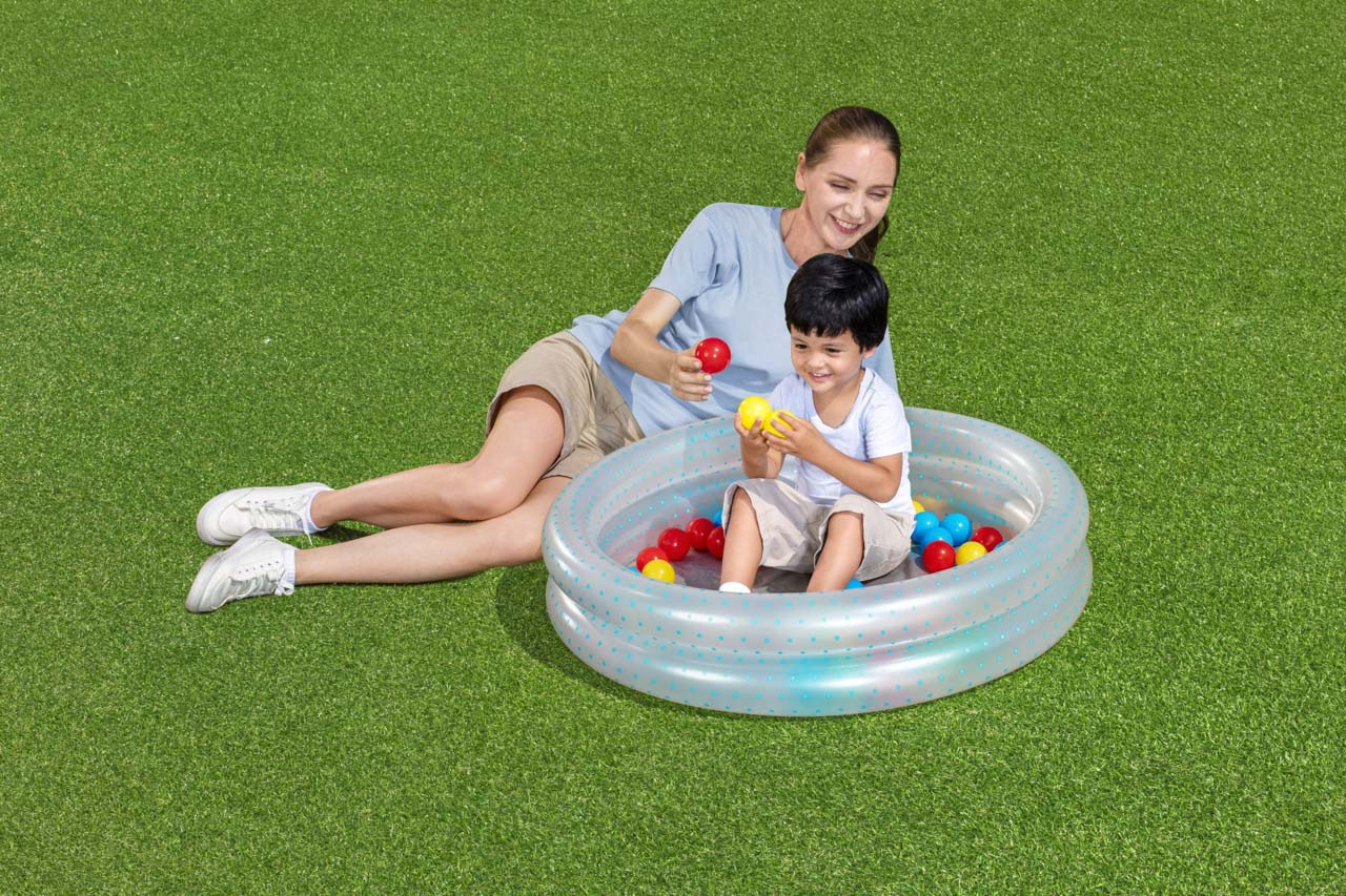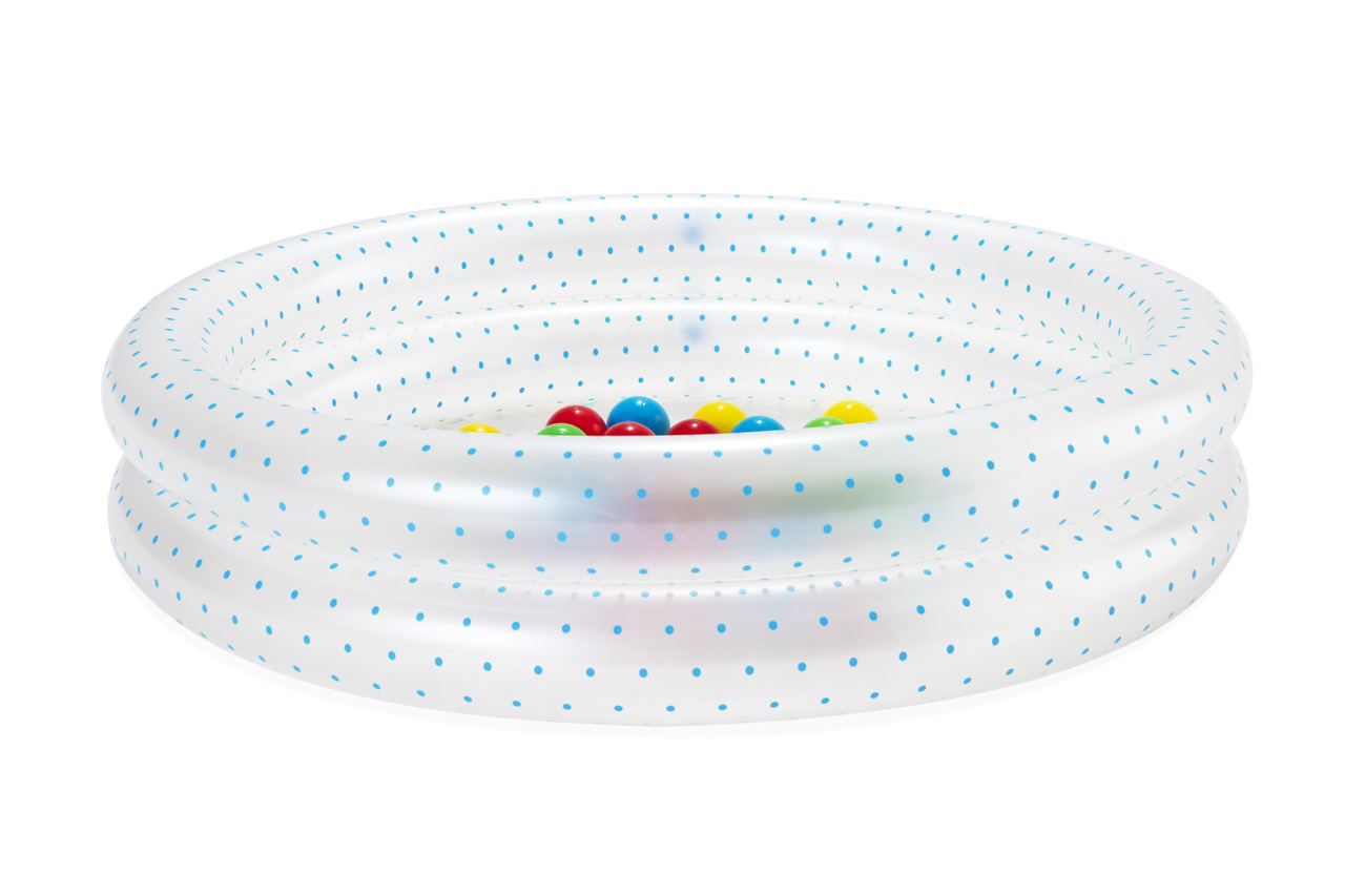 Dětský bazén s míčky. Dva nafukovací kruhy zajišťují dětem měkkou podporu. Hru s 50 vícebarevnými hracími míčky si děti zamilují. Když je hezké počasí, naplňte bazének vodou a užijte si vodní hrátky. Bazének se snadno nafoukne, vyfoukne a složí. 2 barevné provedení (světle růžové a světle modré puntíky). Obsahuje: 1 nafukovací bazének, 50 barevných míčků, 1 opravnou záplatu. Rozměr bazénku: 91 x 20 cm. Rozměr balení: 30x30x13cm. Věk: 2+. Používejte pouze pod dohledem dospělé osoby.