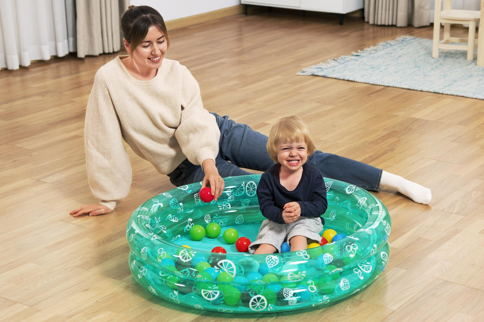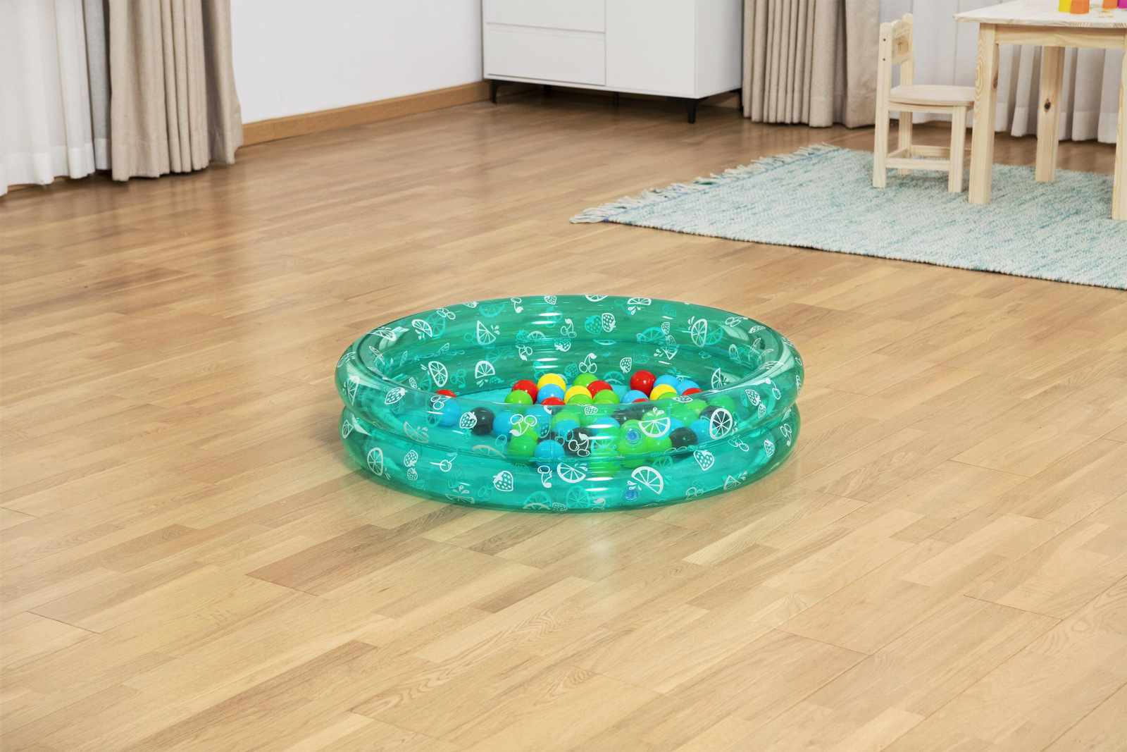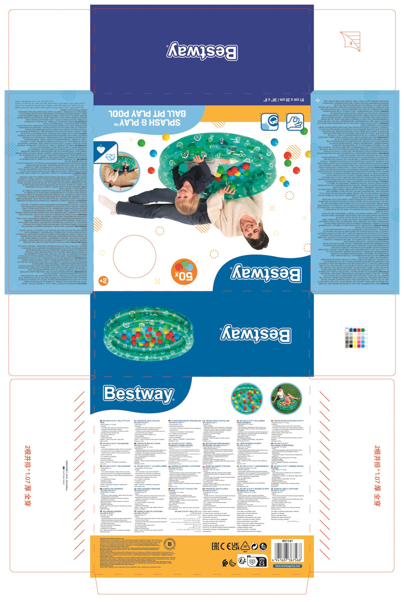 Bestway® Nafukovací bazén Splash & Play™ s 50 hracími míčky. Tato nafukovací hračka 2 v 1 přináší zábavu s míčky a bazén přímo do vašeho obývacího pokoje nebo na dvorek! Nafukovací stěny poskytují stabilní oporu, zatímco vaše ratolesti prozkoumávají bazén. Když je dobré počasí, můžete Splash & Play™ naplnit vodou a použít jej jako brouzdaliště. Bazén se snadno nafukuje a vyfukuje, takže jej lze rychle postavit a uložit. Napomáhá k rozvoji jemné motoriky. Pomáhá dítěti rozvíjet koordinaci rukou a oka, stejně jako základní úroveň zručnosti. Také podporuje sebedůvěru dítěte pomoci interaktivní hry. Vyrobeno z kvalitního a odolného PVC. Bazén má 2 vzduchové komory. Včetně opravné záplaty. Max kapacita: 73 l Nafouknutá velikost bazénu: Ø 91x20 cm. Nenafouknutá velikost bazénu: 83 x 83 cm. Rozměry balení: 30 x 33 x 13 cm. Používejte pouze pod dohledem dospělé osoby. Věk: 2+