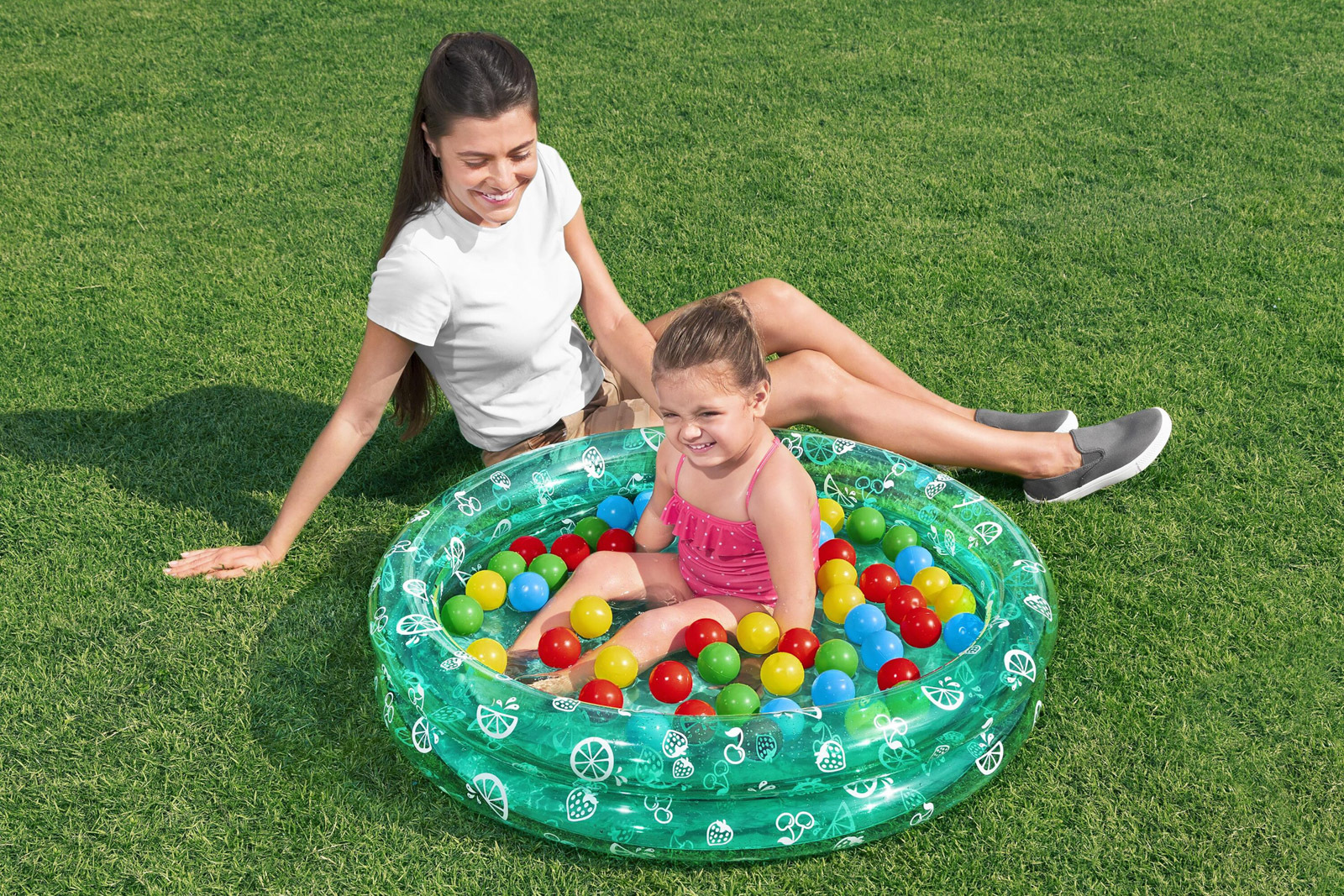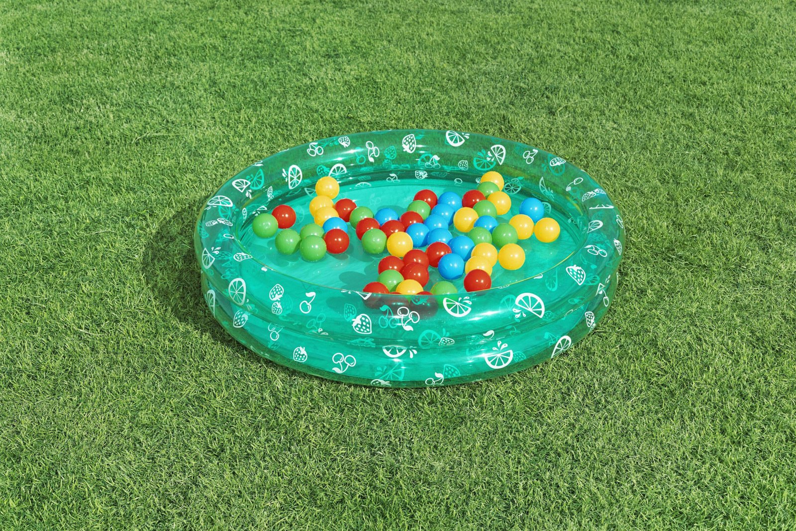 Pevný materiál. Plněno vzduchem. Hladké švy. Může být použito společně s mnoha produkty Bestway. Průměr 5,85 cm. Obsah: 100 herních míčků. Balení:25x19x35cm . Věk: 12m+.