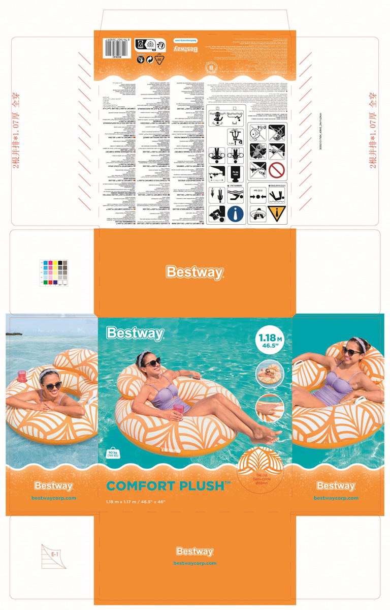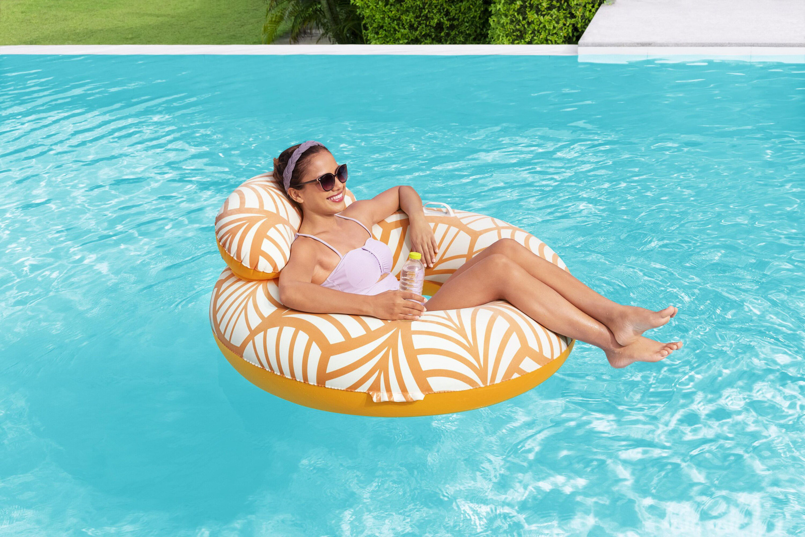 Bestway® Nafukovací kruh s opěrkou hlavy Comfort Plush Deluxe™. Luxusní a sametový povrch. Vyrobený z velmi kvalitního a odolného PVC velurového materiálu a disponuje průměrem 118 cm. Kruh Bestway je vybaven opěradlem, odolnými madly a prostorem na láhev nebo plechovku s vaším oblíbeným pitím. Barva materiálu se po vložení do vody rozjasní a zesílí. Včetně opravné záplaty. Nafouknutá velikost kruhu: Ø 104 x 48 cm. Nenafouknutá velikost kruhu: Ø 118. Rozměry balení: 24 x 24 x 11 cm. Určeno pro 1 osobu. Maximální nosnost: 90 kg. Věk: 14+