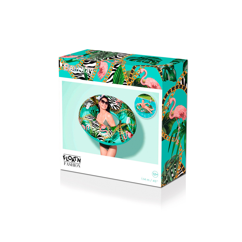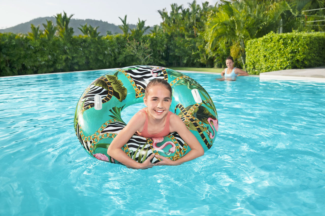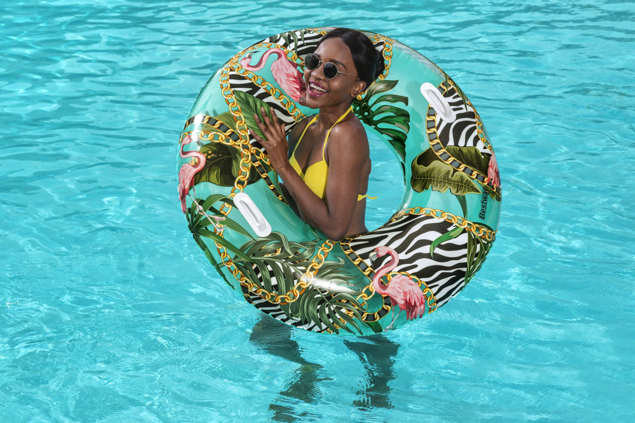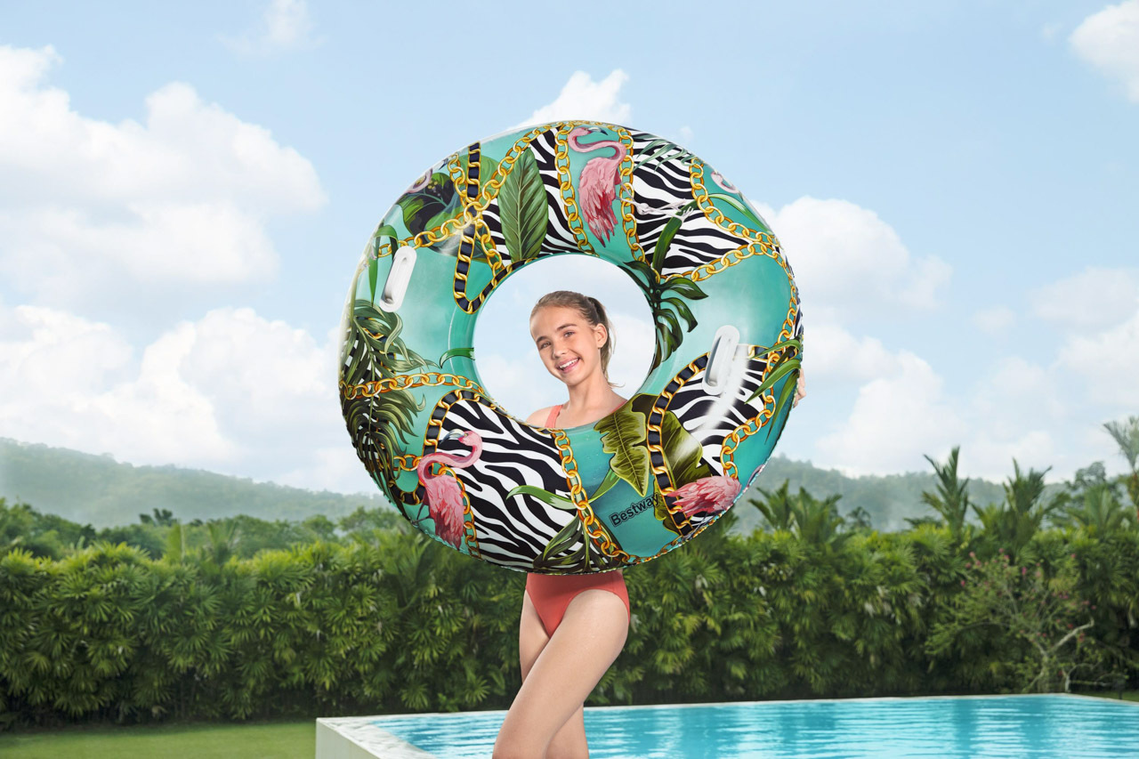 Nafukovací kruh s motivem divočiny. Vyrobeno z velmi odolného materiálu. Dvě robustní plastové rukojeti. Bezpečnostní ventily pro snadné nafouknutí a vyfouknutí. Průměr: 114cm Věk: 12+