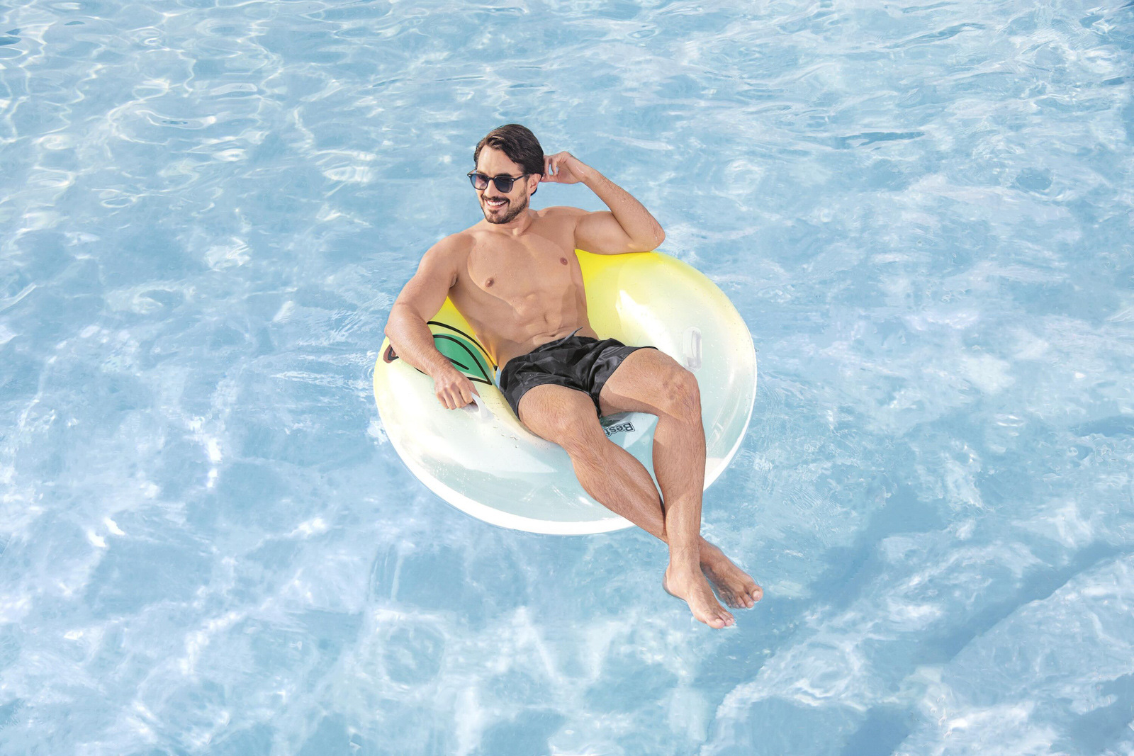 Nafukovací kruh do vody ve veselém letním designu. Vyroben z velmi odolného materiálu se dvěma pevnými madly. K dispozici ve dvou barvách. Průměr: 91 cm. Věk: 10+