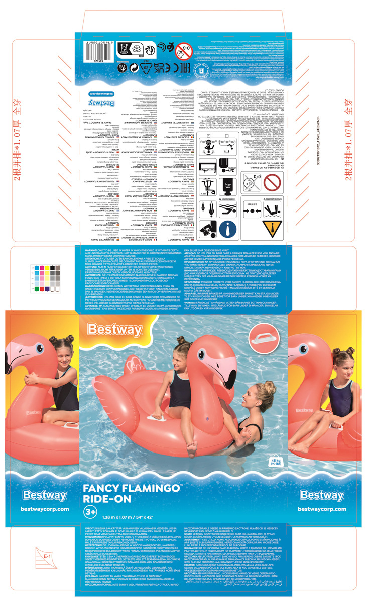 Bestway® Velký nafukovací plameňák je ideální k moři, rybníku i do bazénu. Stabilní konstrukce a robustní plastové rukojeti vám pomohou udržet větší stabilitu. Vyrobeno z kvalitního a odolného PVC. 2 vzduchové komory. Včetně opravné záplaty. Nafouknutá velikost plameňáka: 87 x 110 x 128 cm. Nenafouknutá velikost plameňáka: 107 x 138 cm. Rozměry balení: 24 x 24 x 8 cm. Určeno pro 1 dítě. Maximální nosnost: 45 kg. Používejte pouze pod dohledem dospělé osoby a ve vodě, kde dítě dosáhne na dno. Věk: 3+