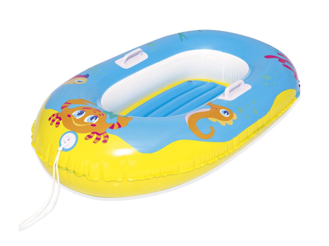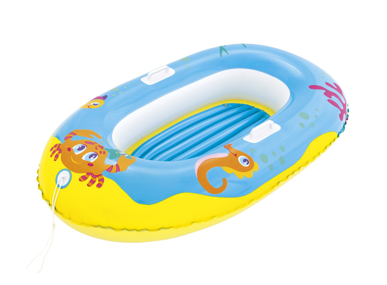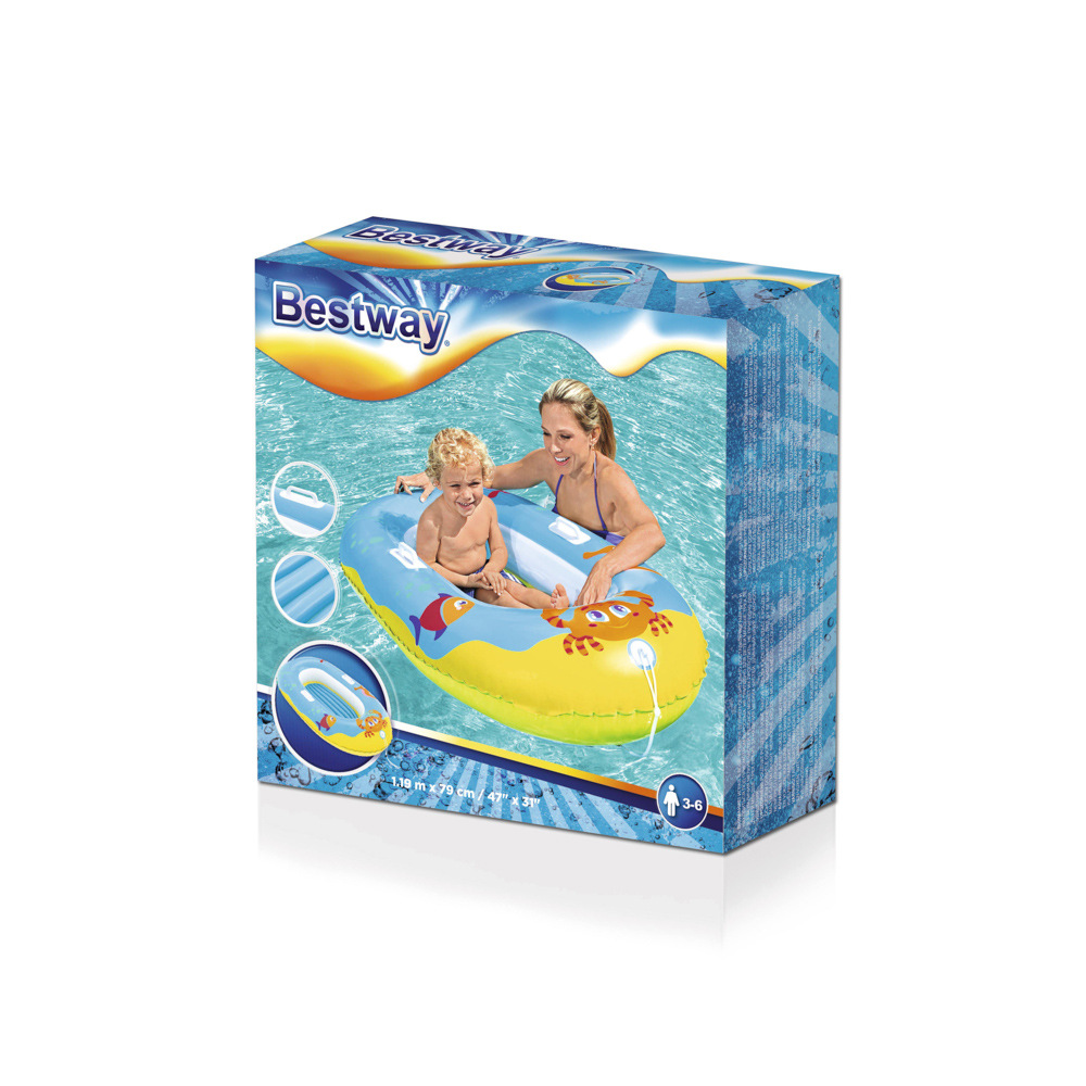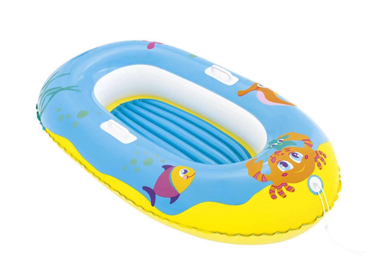 Dětský nafukovací člun Bestway. Nádherné barevné provedení s obrázky mořských zvířátek (dvě barevné varianty – modrá a žlutá). Průhledné okénko v úrovni hlavy je navrženo tak, aby děti mohly pozorovat vše, co se děje pod hladinou. Pro pohodlné sezení je nafukovací také dno člunu. Pro možnost tažení je součástí i provaz/lanko, které je pevně uchyceno v plastovém oušku. Dopřejte svým dětem pohádkové lenošení na vodě. Vyroben z kvalitního a odolného vinylu. Rozměr: 102 x 69 cm. Obsahuje: 1 nafukovací člun. Používejte pouze pod dohledem dospělé osoby. Věk: 3-6 let