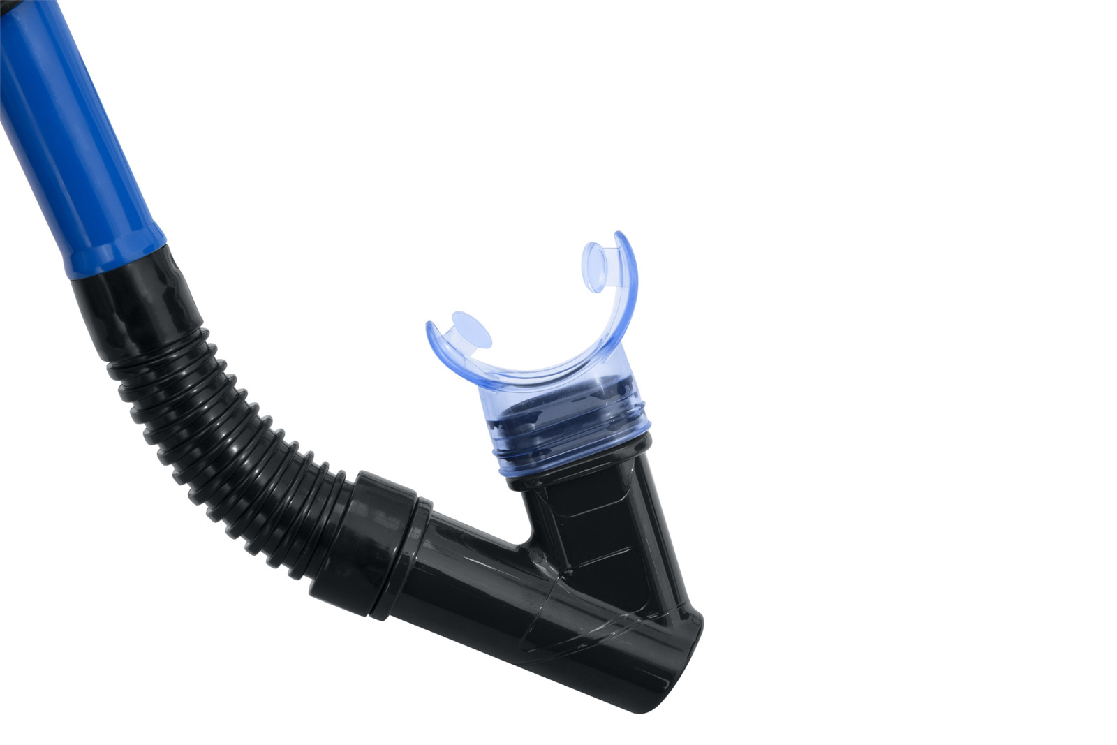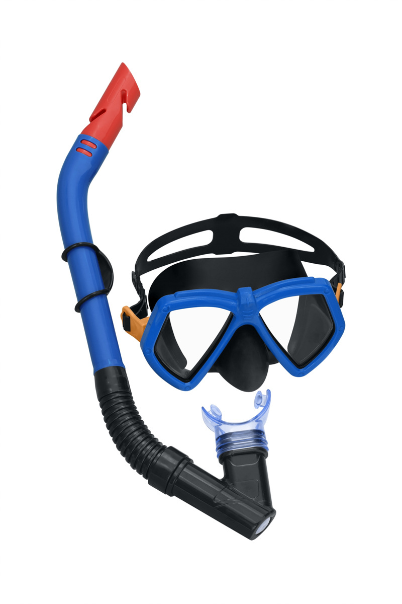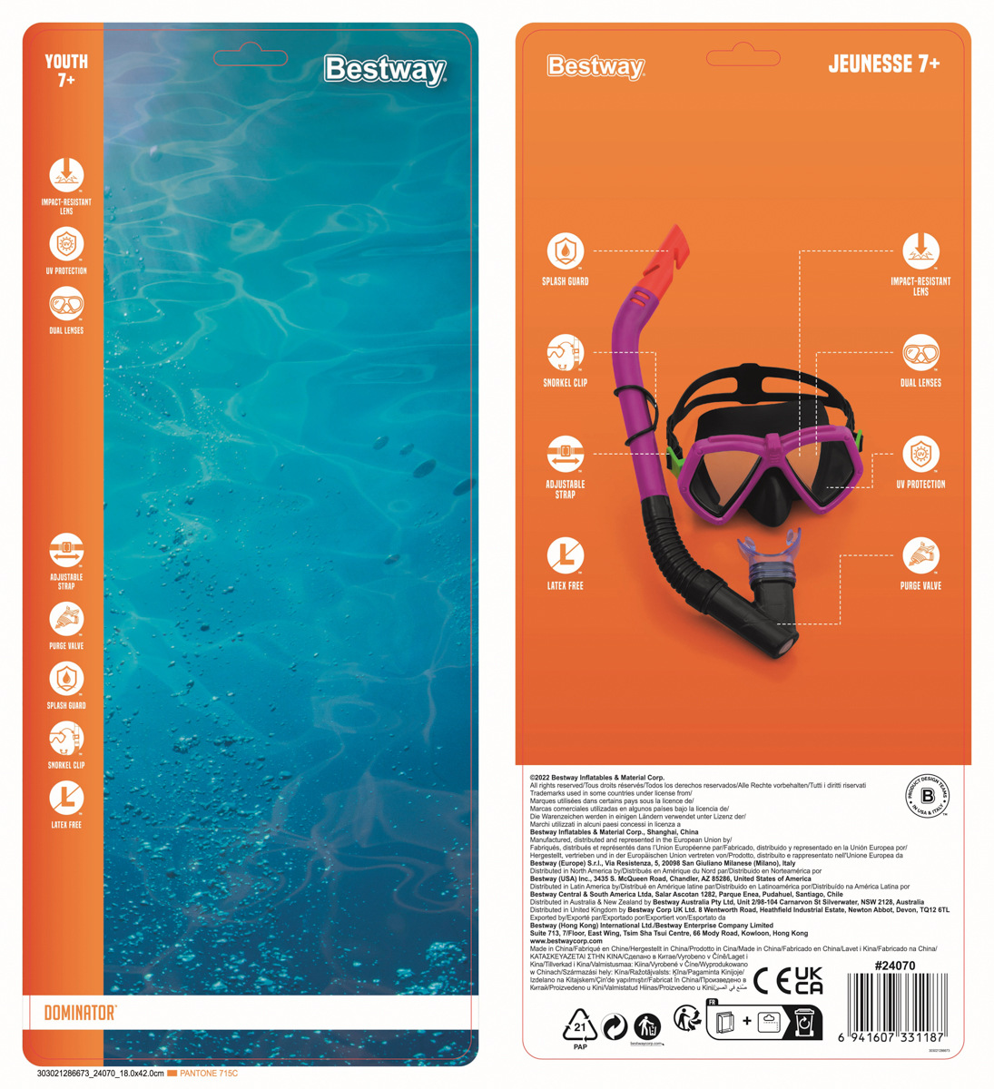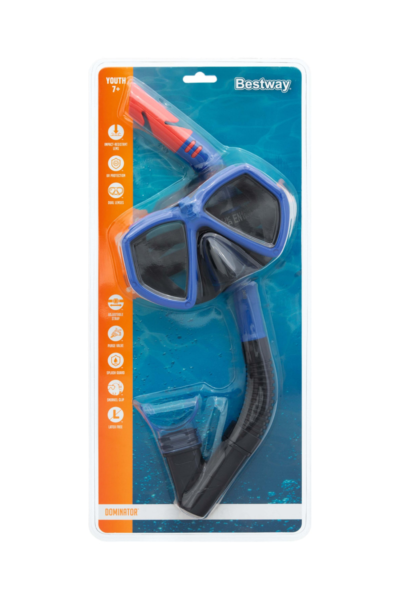 Bestway šnorchlovací set Dominator – brýle a šnorchl. Brýle mají polykarbonátové čočky ve tvaru leteckých brýlí s UV ochrannou vrstvou. Komfortní, dvojité těsnění lemu brání vnikání vody do brýlí. Plně nastavitelný dělený silikonový pásek. Šnorchl má měkký a pohodlně přiléhající náustek. Technologie Dry Top je speciální vylepšení šnorchlu, které zabraňuje průniku vody do úst. 100 % bez latexu. 2 barevné provedení (modrá, růžová). Věk: 7+