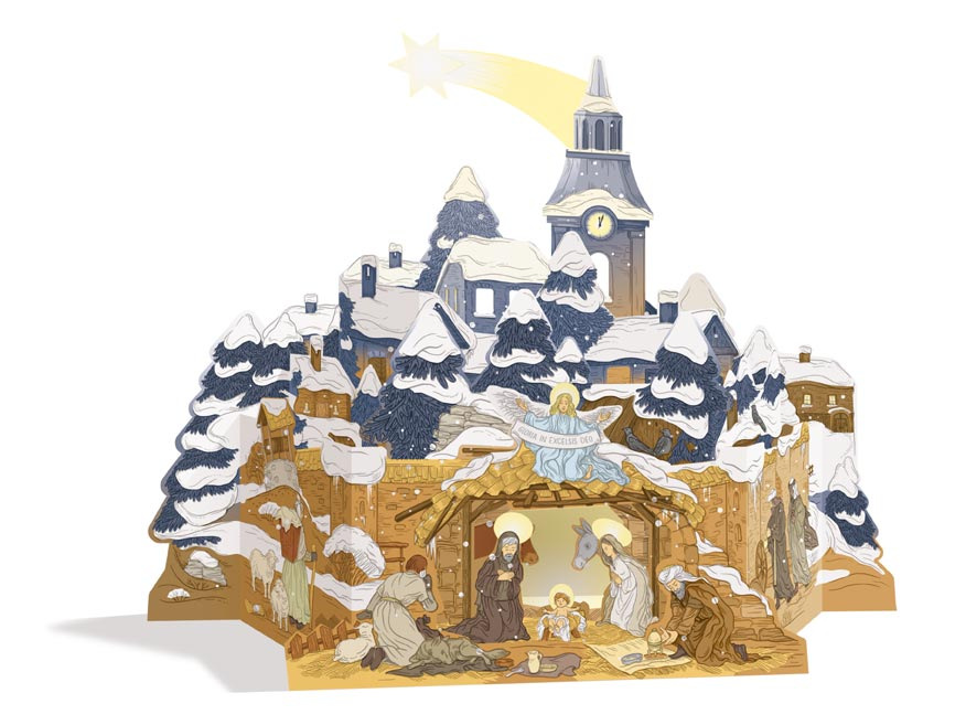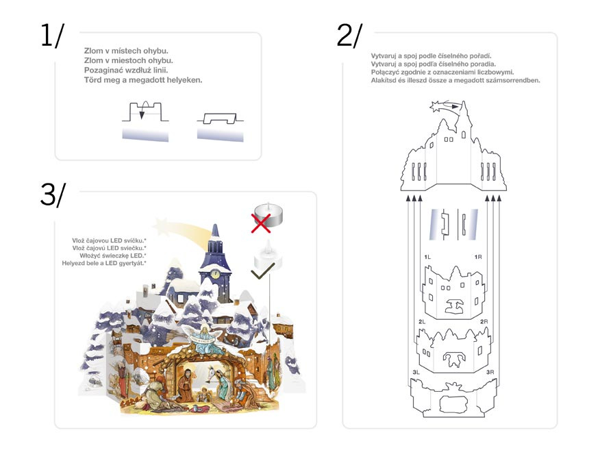 Skládací betlém barevný z kartonu. Poskládejte si papírový betlém s Josefem, pannou Marií a malým Ježíškem v jesličkách. Najdete zde vyobrazené i Tři Krále, nebo-li mudrce z východu, Kašpara, Melichara a Baltazara. Sestavení je velice jednoduché a nepotřebujete k němu žádné nástroje. Betlém se skládá ze 4 dílů a jde velice lehce rozložit a zase uschovat. Do betlému můžete vložit čajovou elektrickou svíčku, která dodá betlému tu pravou vánoční atmosféru. POZORr: použití pouze s LED svíčkou na baterie (max. 3V)Na zadní straně balení je návod k sestavení betlému.Svíčka není součástí balení. Betlém je zabalen v sáčku. Uvedená cena je za 1 ks.