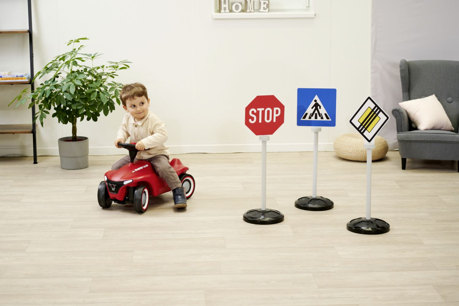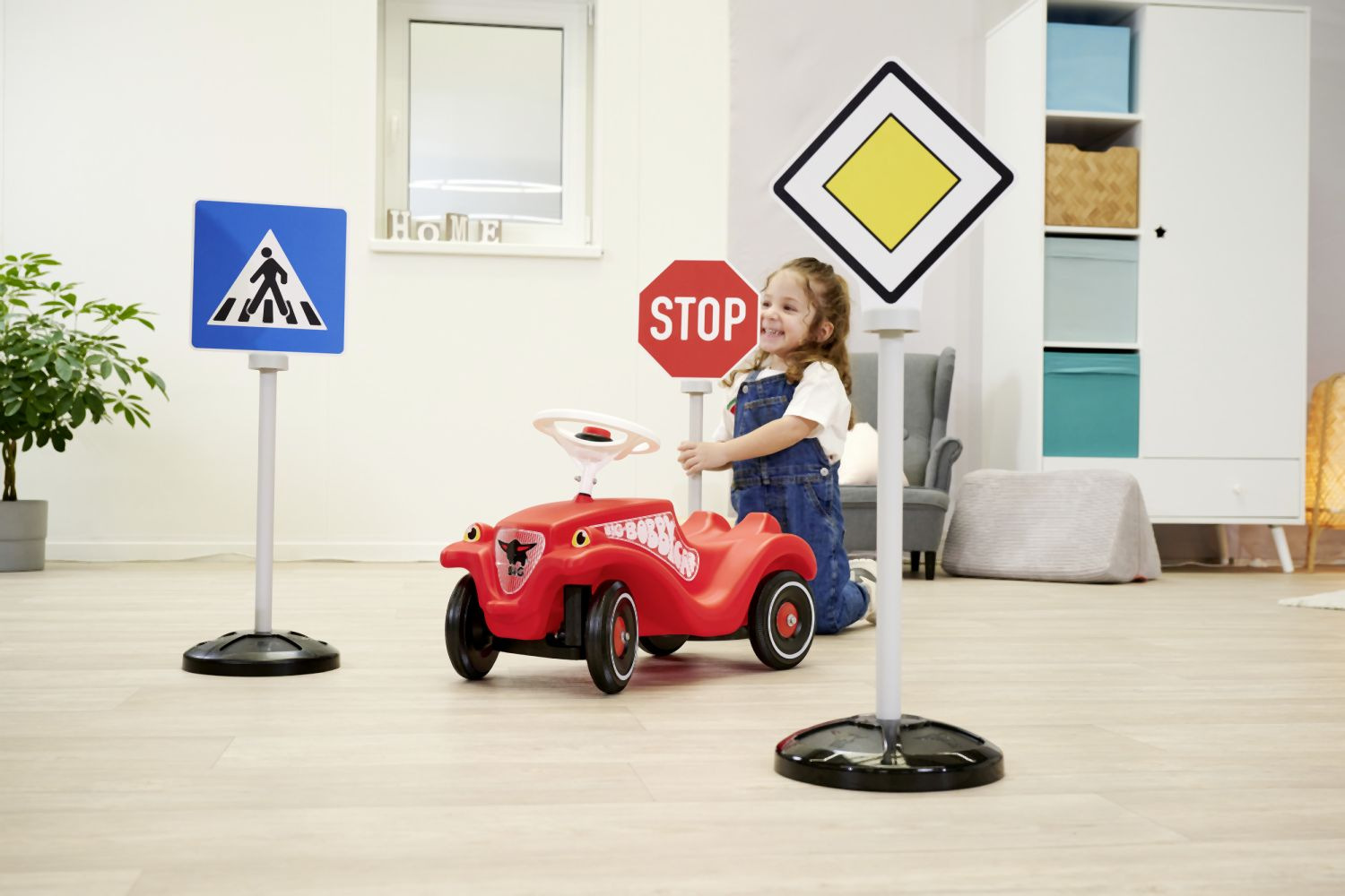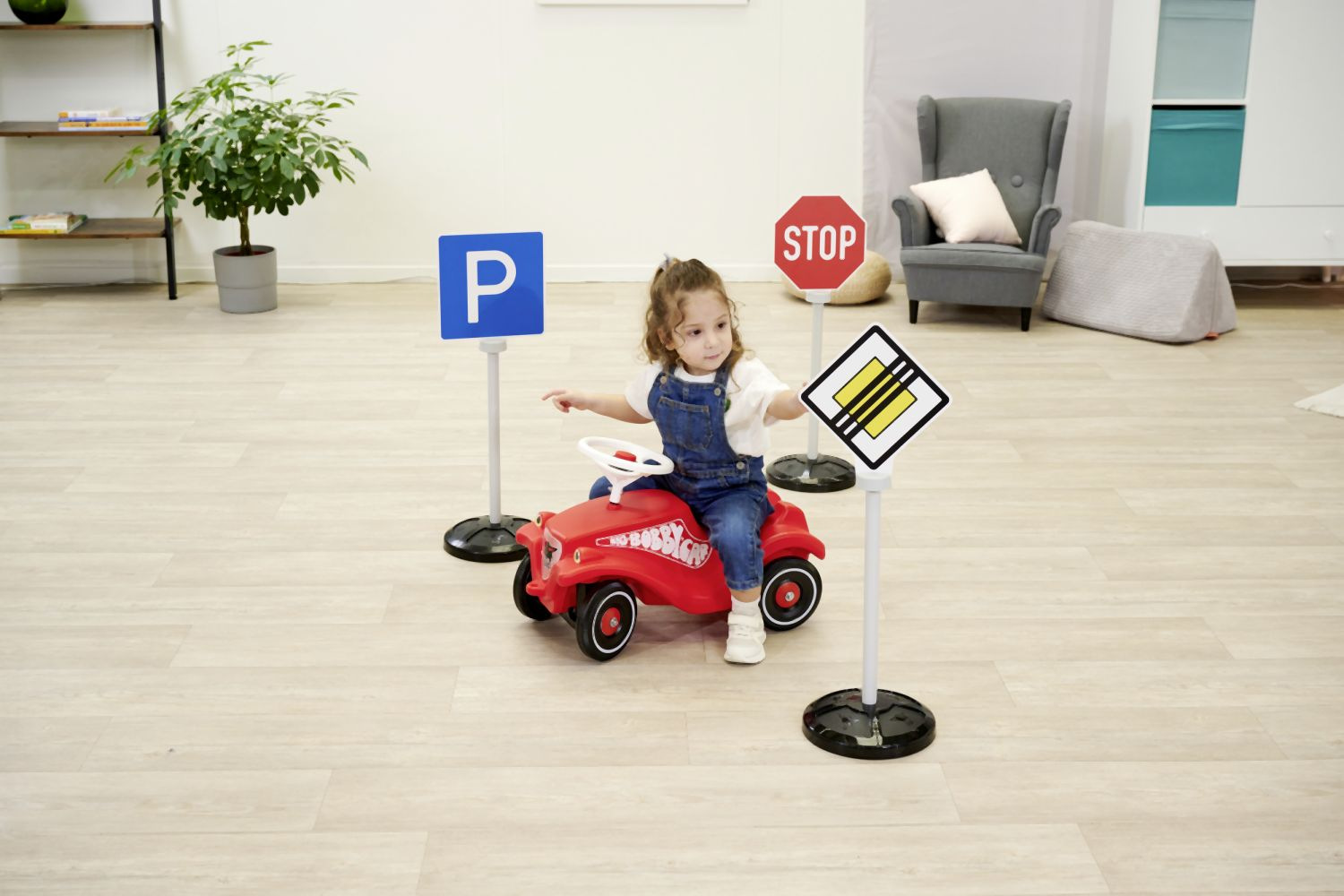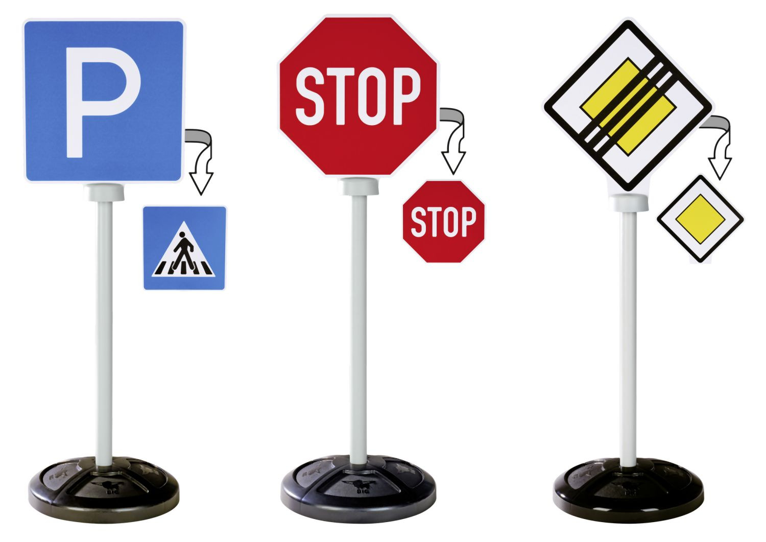 Set 3 dopravních značek s 5 originálními symboly, potisknutými oboustranně - hlavní silnice/konec hlavní silnice, stop/stop, parkování/přechod pro chodce. Dopravní značky jsou odolné vůči UV záření a neztrácejí barvu, se stojanem. Výška značky 69 cm. Celková váha 0,8 kg.