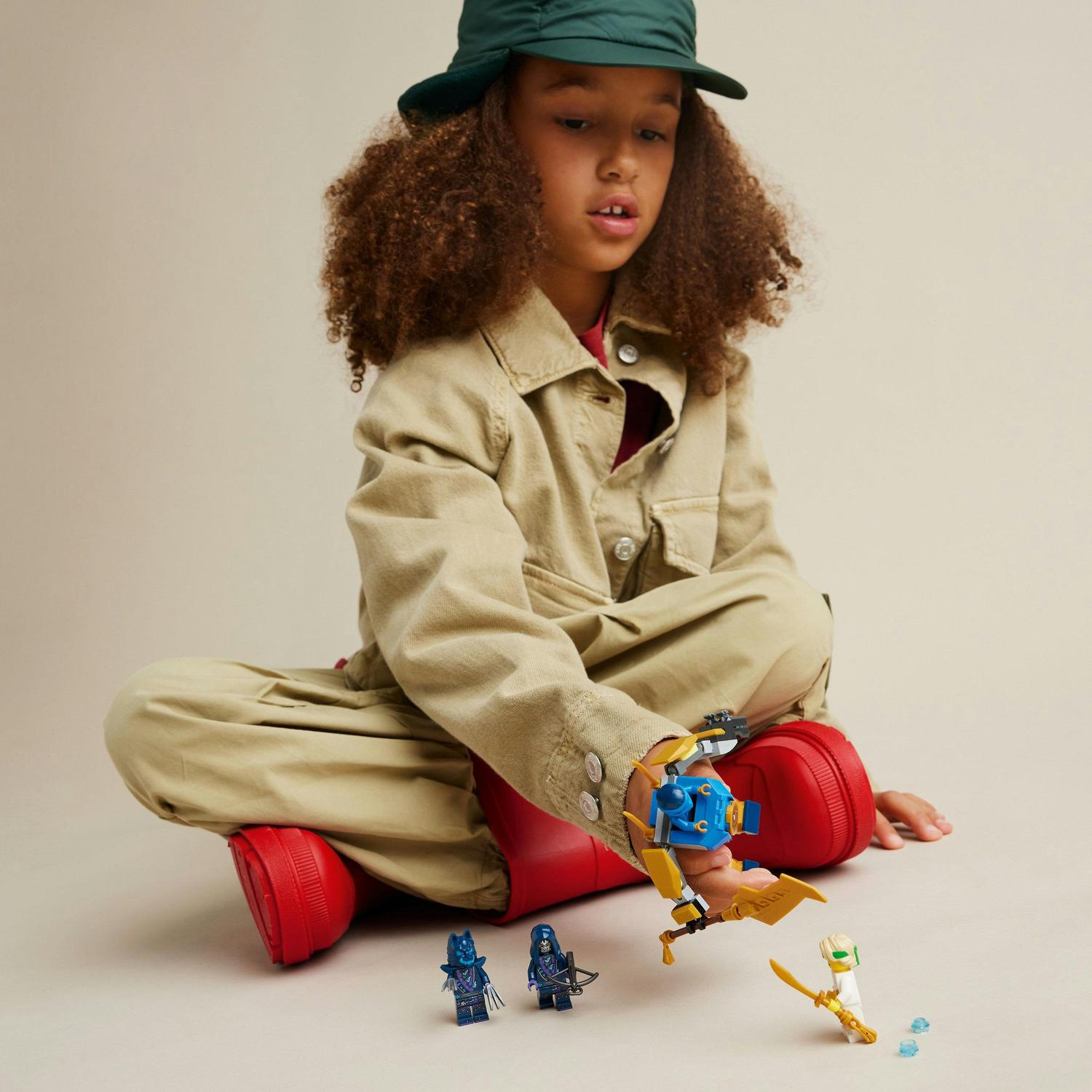 Děti od 6 let se stavebnicí LEGO® NINJAGO® (71805) Bojový balíček Jayova robota znovu prožijí akční bojové scény z 2. řady televizního seriálu NINJAGO® Dračí povstání. Součástí této nindžovské stavebnice je robotický oblek s pohyblivými pažemi, nohama a trupem, který třímá velký zlatý meč a střílí ze 2 vystřelovačů.