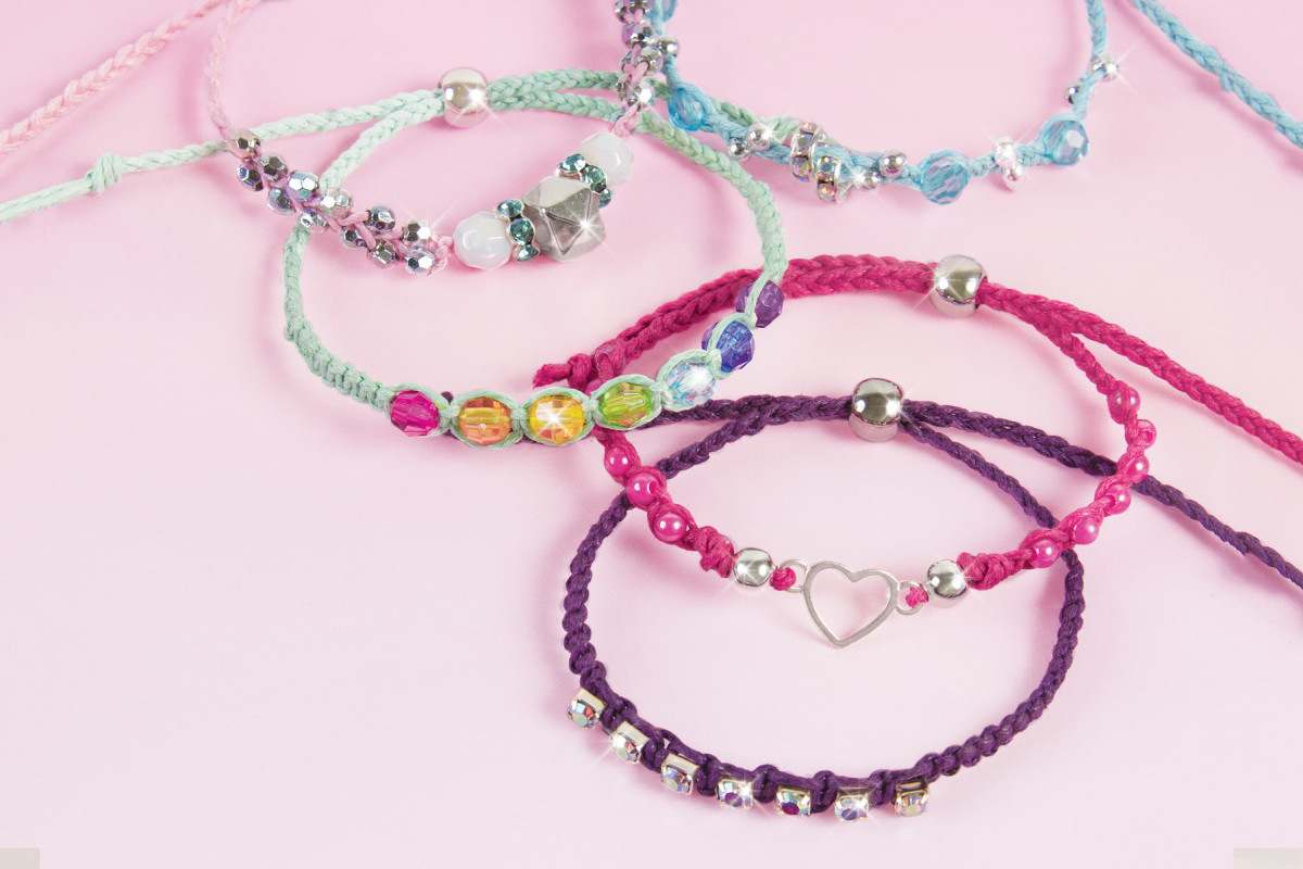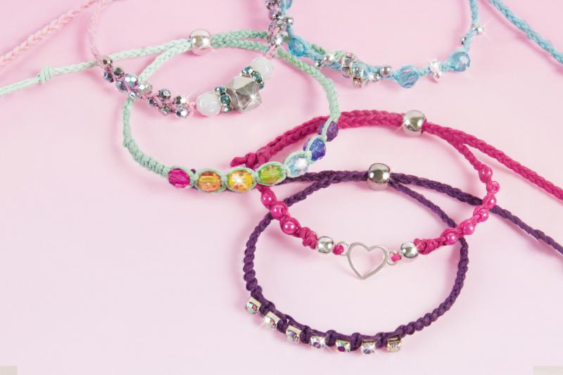 Výroba náramků z bavlnek a korálků. Korálky se vkládají nebo navlékají na bavlky, které jsou součástí balení. Obsahuje mnoho barevných a blýskavých korálků. Baleno v krabici. Doporučený věk 8+