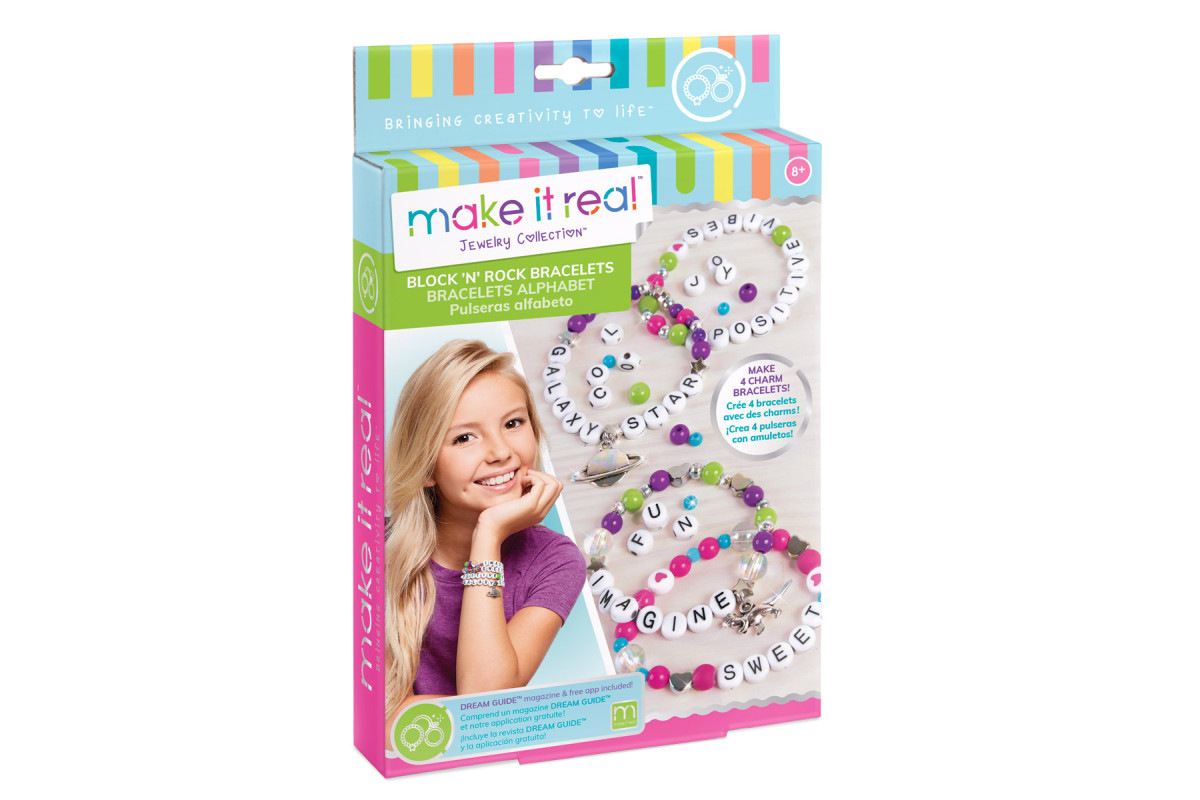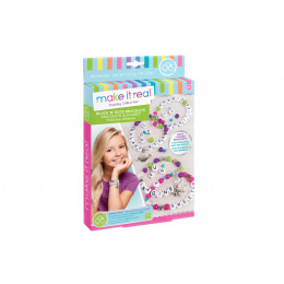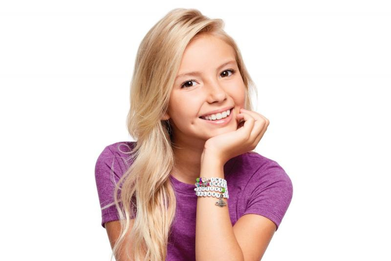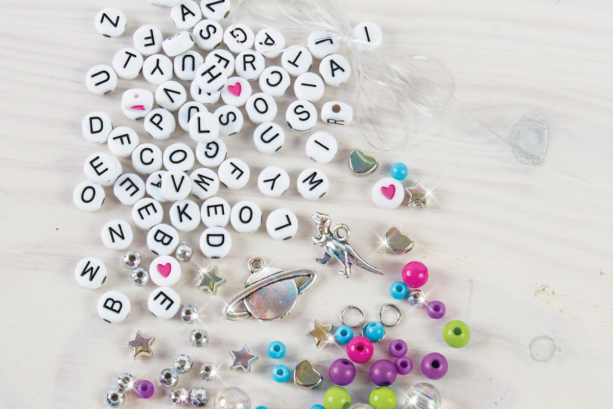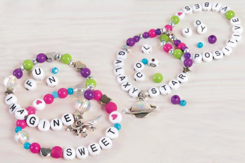 Výroba náramků které se skládají z korálků a písmenek. Korálky se navlékají na vlasec, který je součástí. Součástí je mnoho barevných korálků barevných a písmenek i doplňků. Baleno v krabici. Doporučený věk 8+