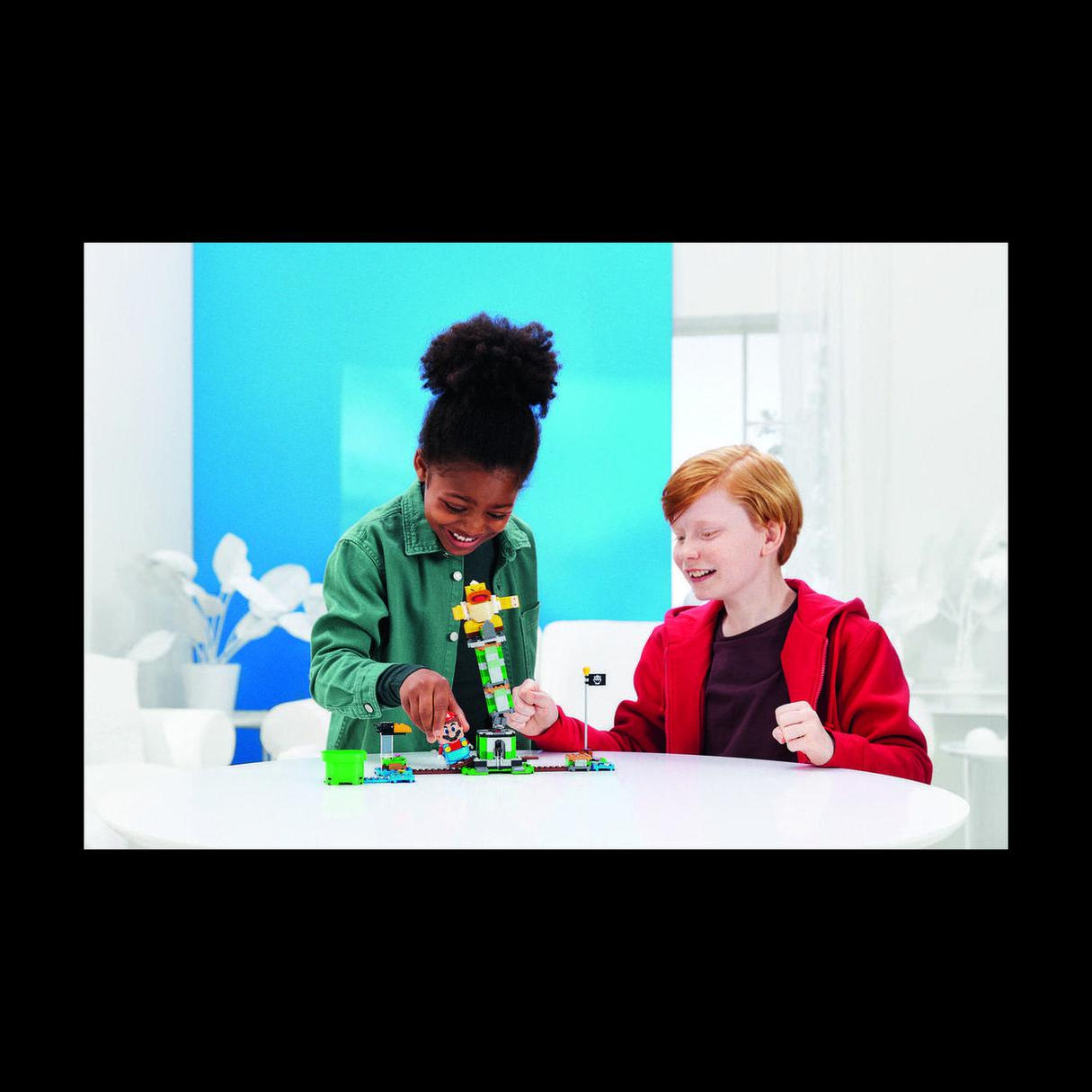 - Obsahuje sestavitelnou věž, kterou mohou LEGO® Mario™ nebo LEGO® Luigi™ (figurky nejsou součástí balení) zbořit pomocí páček ve spodní část modelu. Přemozte hlavního protivníka a najděte akční kostku Super Star.