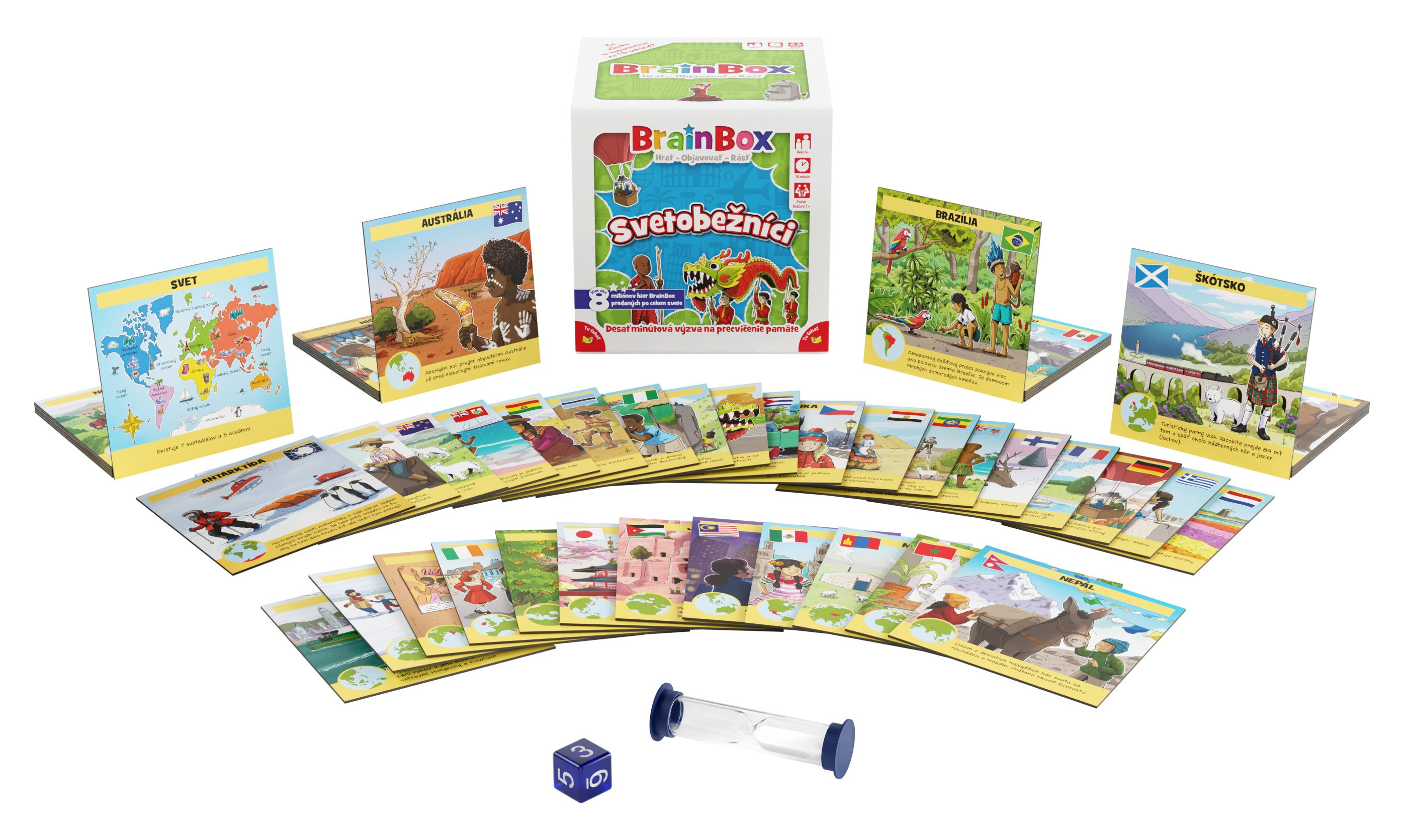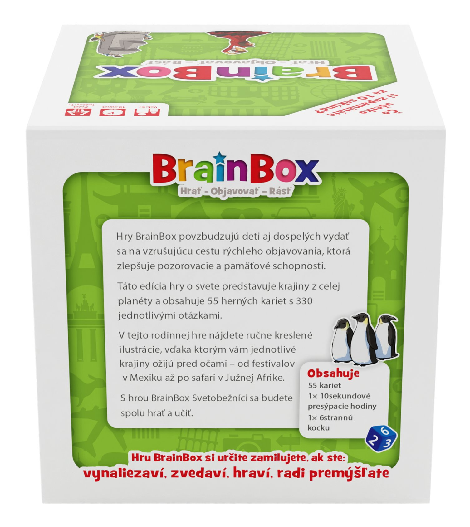BrainBox je zábavná paměťová a postřehová karetní hra, která otestuje váš smysl pro detail. Odpovědi na všechny otázky máte přímo před sebou na kartě. Bude vám stačit 10 vteřin na to, abyste si všechno zapamatovali? Tato edice hry, věnovaná zemím z celé planety, vám představí jejich ikonická místa, zvyky a zajímavé informace. Věděli jste, že velbloudí dostihy jsou oblíbené v celém arabském světě a že někteří velbloudi se dokonce účastní i soutěží krásy? A že japonský tradiční oděv kimono doslova znamená "věc na nošení"? Hra BrainBox Světoběžníci obsahuje 55 hracích karet s ručně malovanými ilustracemi, které vám doslova oživí každý pohled na danou zemi. Hra pomáhá dětem dozvědět se více o úžasných zemích naší planety a jejich obyvatelích, a přitom rozvíjí kognitivní dovednosti, jako je postřeh a vybavování si vzpomínek, které tvoří základ pro celoživotní vzdělávání.