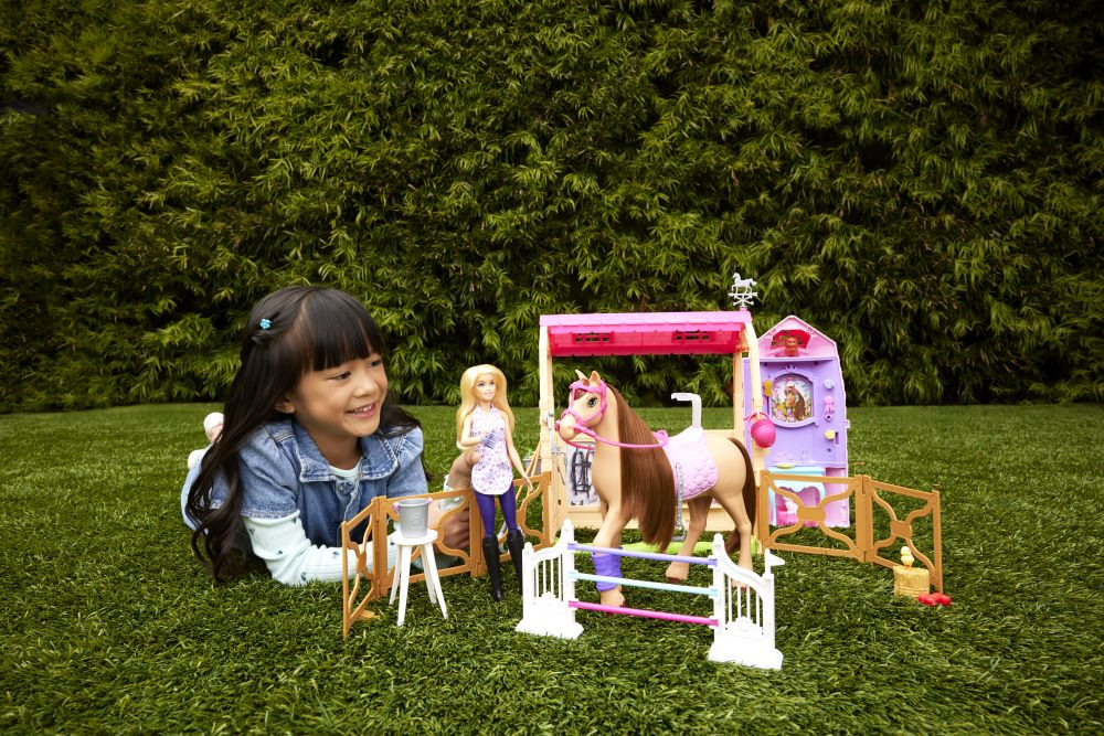 Nový seriál Barbie® na Netflixu přináší herní set stáje, který obsahuje panenku Barbie®, koníka Pepper a více než 30 doplňků jako jsou, kočička, kuřátko, sovička a mnoho dalších herních prvků. Stáj nabízí celkem 360 stupňů hracího prostoru, kde děti mohou krmit, ošetřovat nebo trénovat koníky, vystavovat stuhy (tři jsou součástí balení) nebo se kochat růžovou zahradou.
