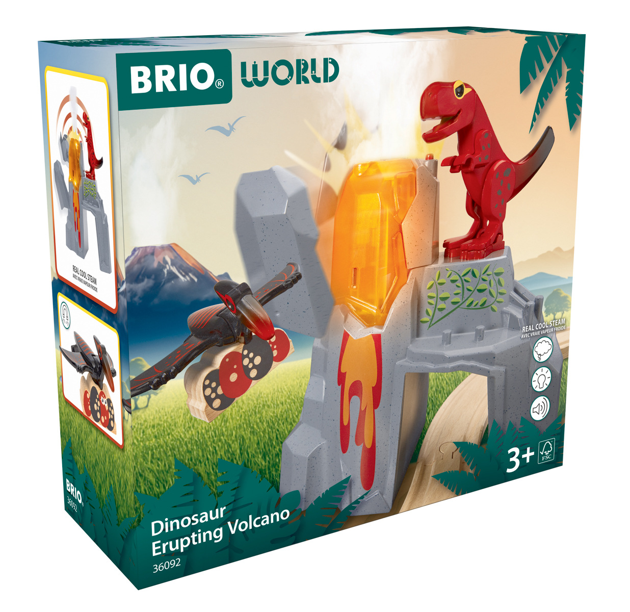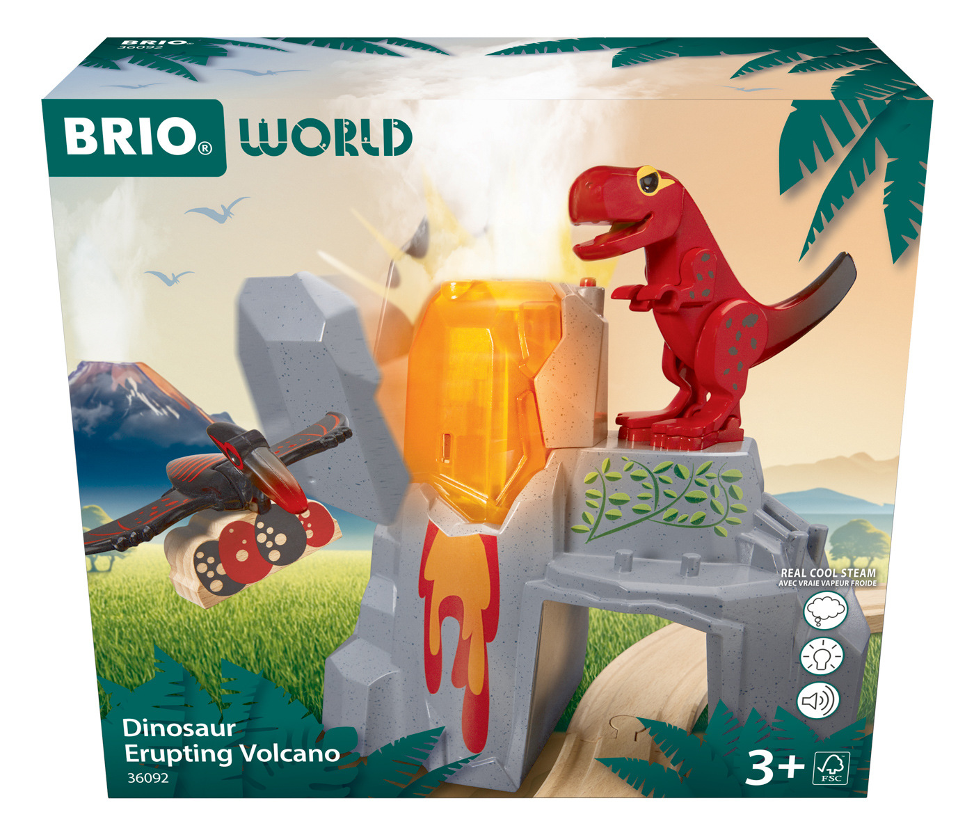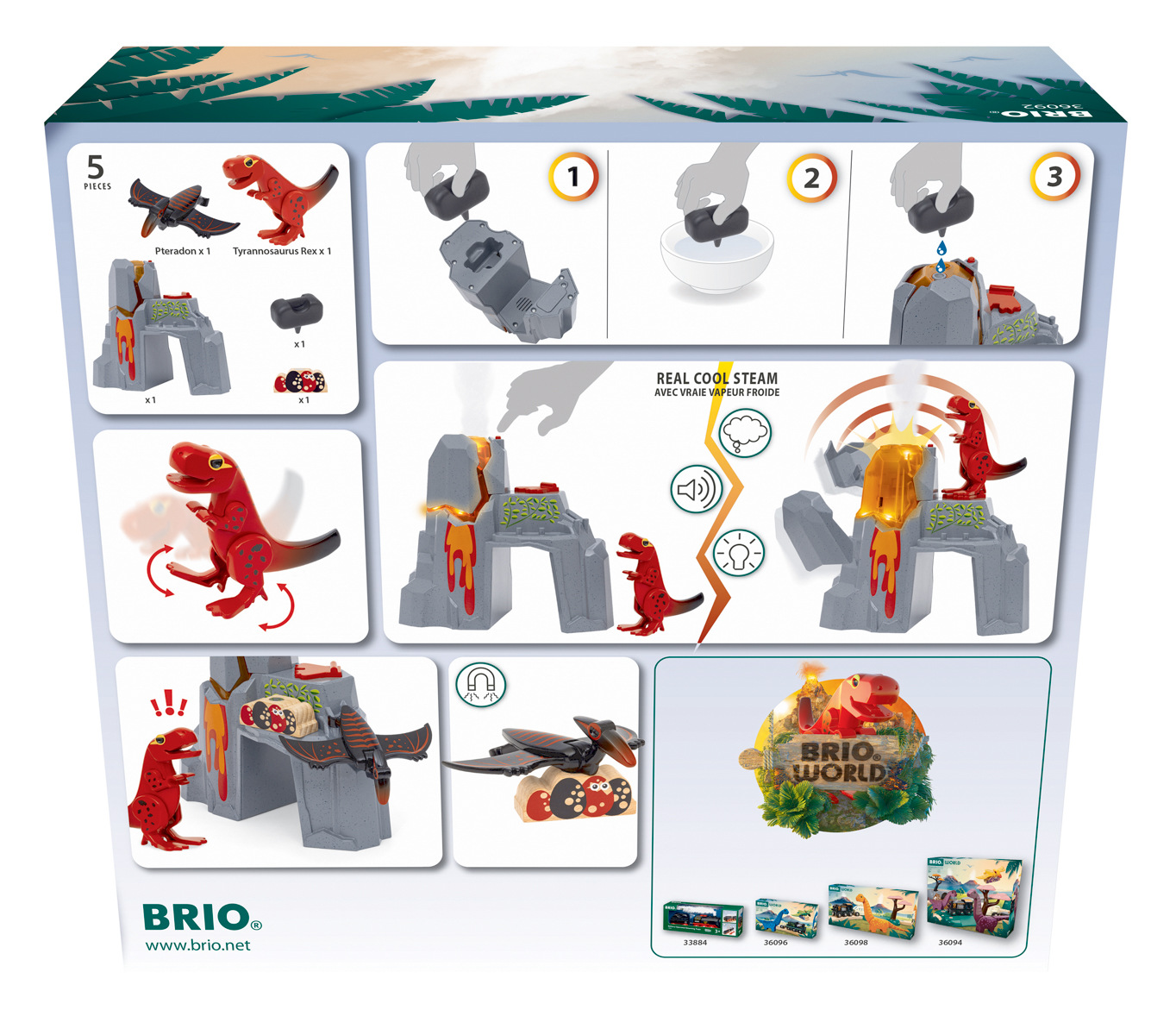 Dunění, rány a rachot! Dinosauří soptící vulkán chystá erupci. Vkročte do impozantních prehistorických dobrodružství začleněním této sady s dinosaury a figurkami do svých plánů světa BRIO World. Probuďte sopku stisknutím tlačítka na jejím vrcholu – aktivuje se světlo žhnoucí lávy, zvuky a efekty na dotek bezpečné páry unikající z jícnu sopky. Pozorujte, jak se vulkán otevírá s tyranosaurem shlížejícím z vrcholu sopky hrdě na své království. Balení: 11x29x27cm. Věk: 3+