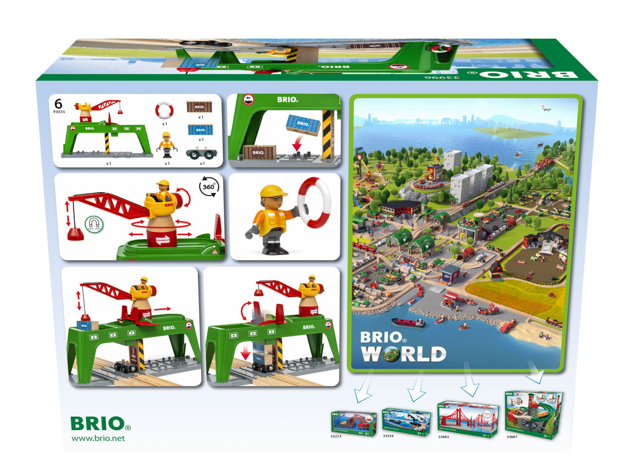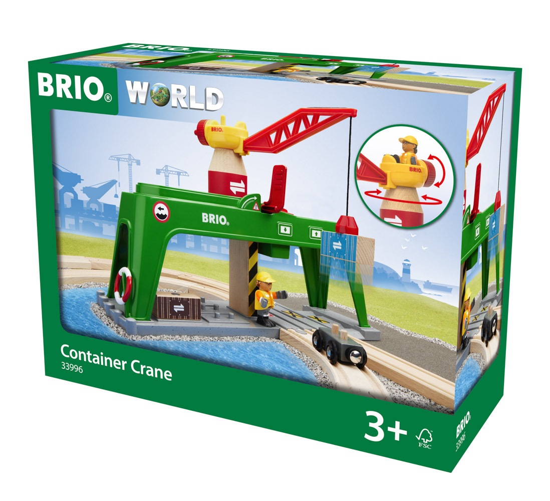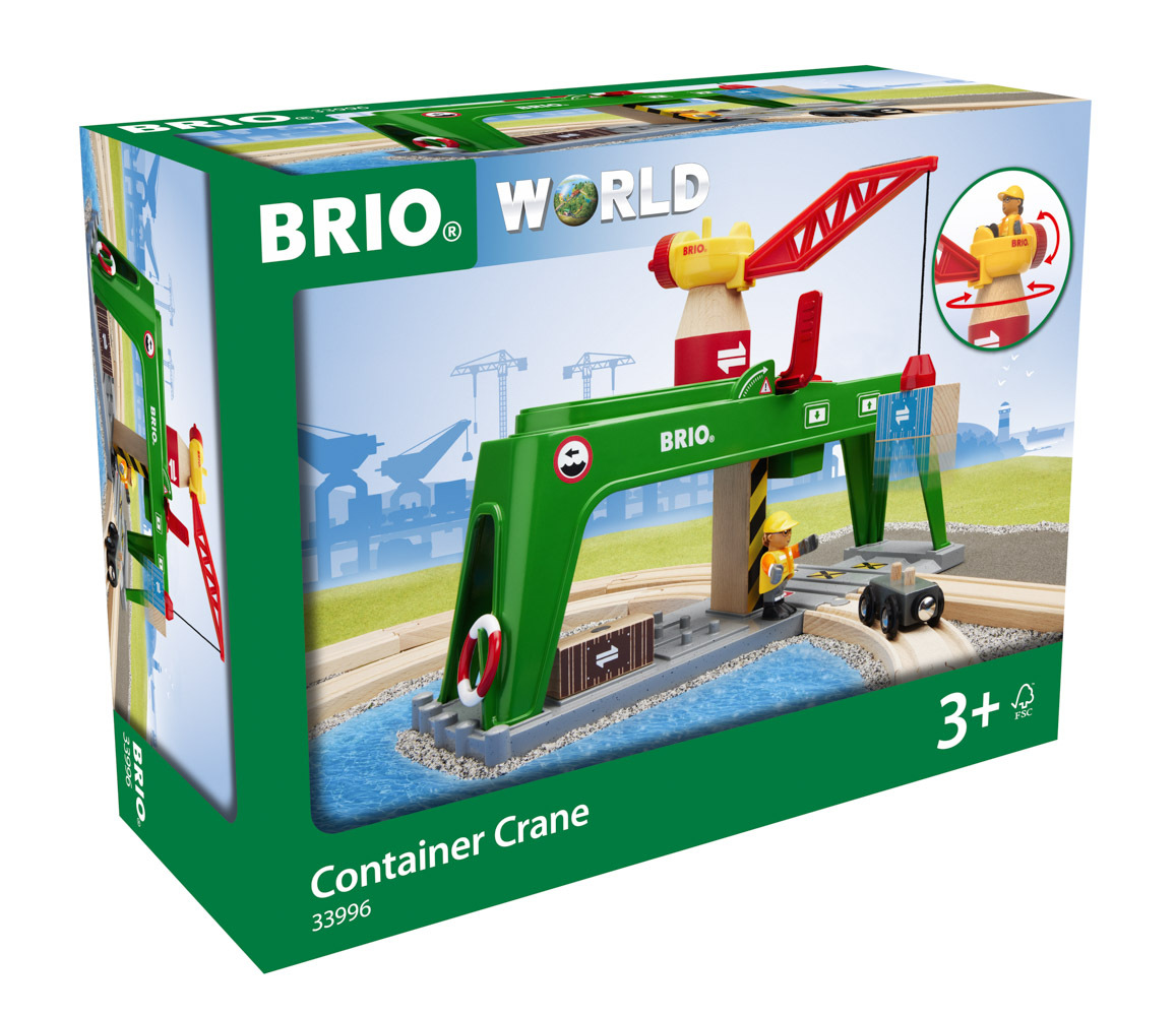 Správa všech těžkých přepravních kontejnerů v doku BRIO World není s kontejnerovým jeřábem žádný problém. Posaďte se na tento velký zelený železniční doplněk a pusťte se do práce. Uchopte jednu z nádob magnetickým hákem, otočte a posuňte velký jeřáb do polohy nad kolejnicemi. "Trochu vlevo, trochu vpravo." Perfektní!". Spusťte dřevěný náklad na místo pomocí navijáku a zajistěte jej červeným víkem, než dokonale spadne na čekající vůz dole. Rozměr balení: 36 x 27 x 14 cm. Věk: 3+