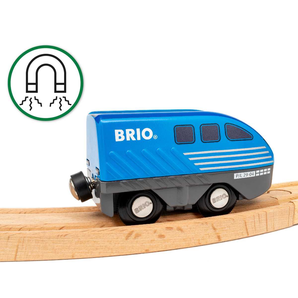 Převezměte řízení a jeďte bezpečně, máte v soupravě cestujícího! Jedinečný ovladač má snadno použitelné funkce couvání a zastavení, dvě různé rychlosti vpřed a vysílací frekvence A a B k zajištění provozu více dálkově ovládaných vláčků na stejné trati. Stisknutím tlačítek aktivujete světelné a zvukové efekty. Vláček lze ovládat i tlačítky na lokomotivě. Střecha vagónu je odklápěcí. Vláček je vybaven klasickými magnetickými spojkami BRIO a lze k němu připojit další vagóny. V soupravě mohou cestovat 1-2 pasažéři. Sada BRIO World je vyrobena ze dřeva s certifikátem FSC® a vysoce kvalitních plastů. Je vhodná pro děti od 3 let a je ideálním dárkem pro chlapce i dívky. Tato sada obsahuje: 1x lokomotivu, 1x cestovní vagón, 1x figurku. Baterie: 4 x AA, nejsou součástí balení. Baleno v krabičce. Rozměry vlakové soupravy: 4,5 x 17 x 4 cm. Rozměry balení: 15 x 29 x 11 cm. Věk: 3+